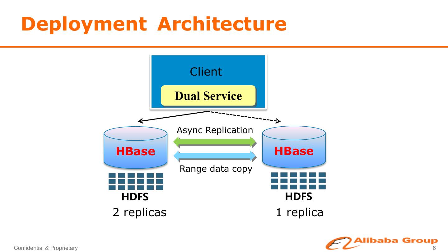 6 . Deployment Architecture Client Dual Service Async Replication HBase HBase Range data copy HDFS HDFS 2 replicas 1 replica Confidential & Proprietary 6