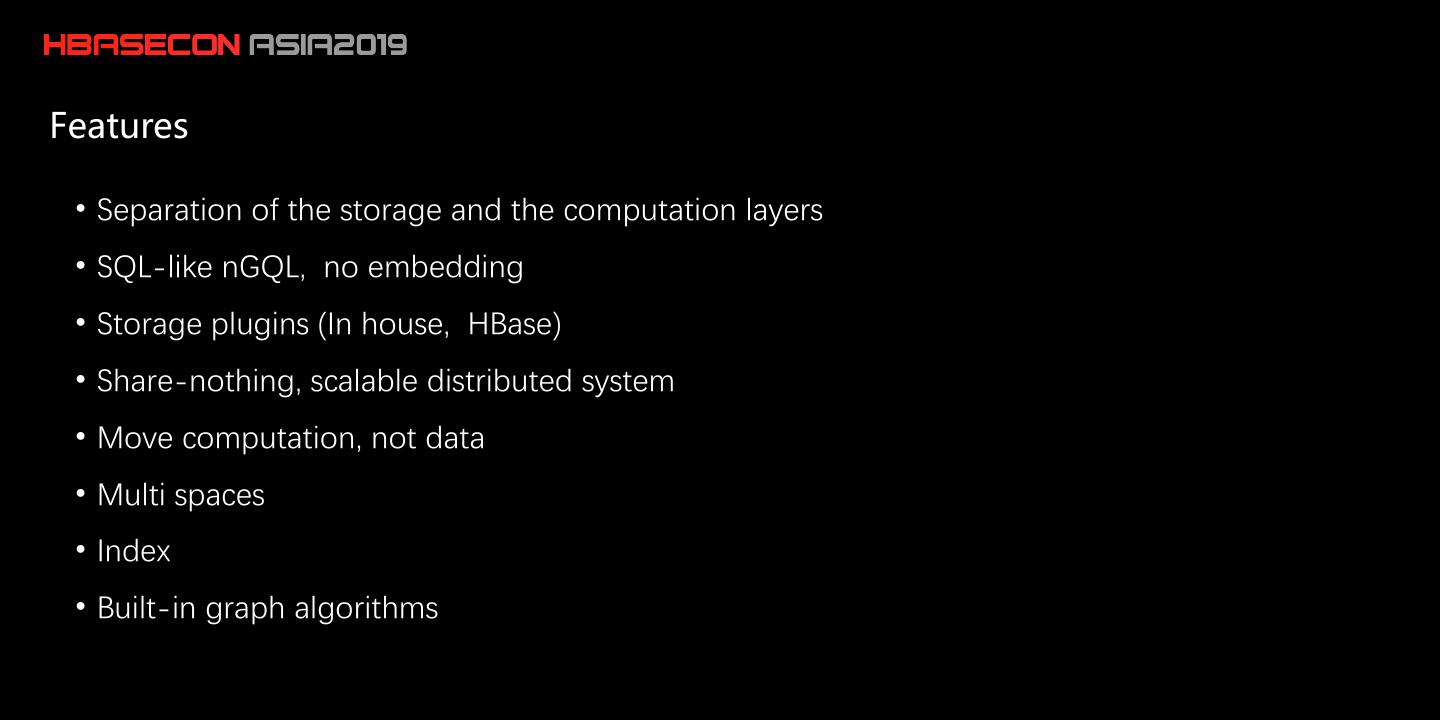 6 .Features • Separation of the storage and the computation layers • SQL-like nGQL, no embedding • Storage plugins (In house, HBase) • Share-nothing, scalable distributed system • Move computation, not data • Multi spaces • Index • Built-in graph algorithms