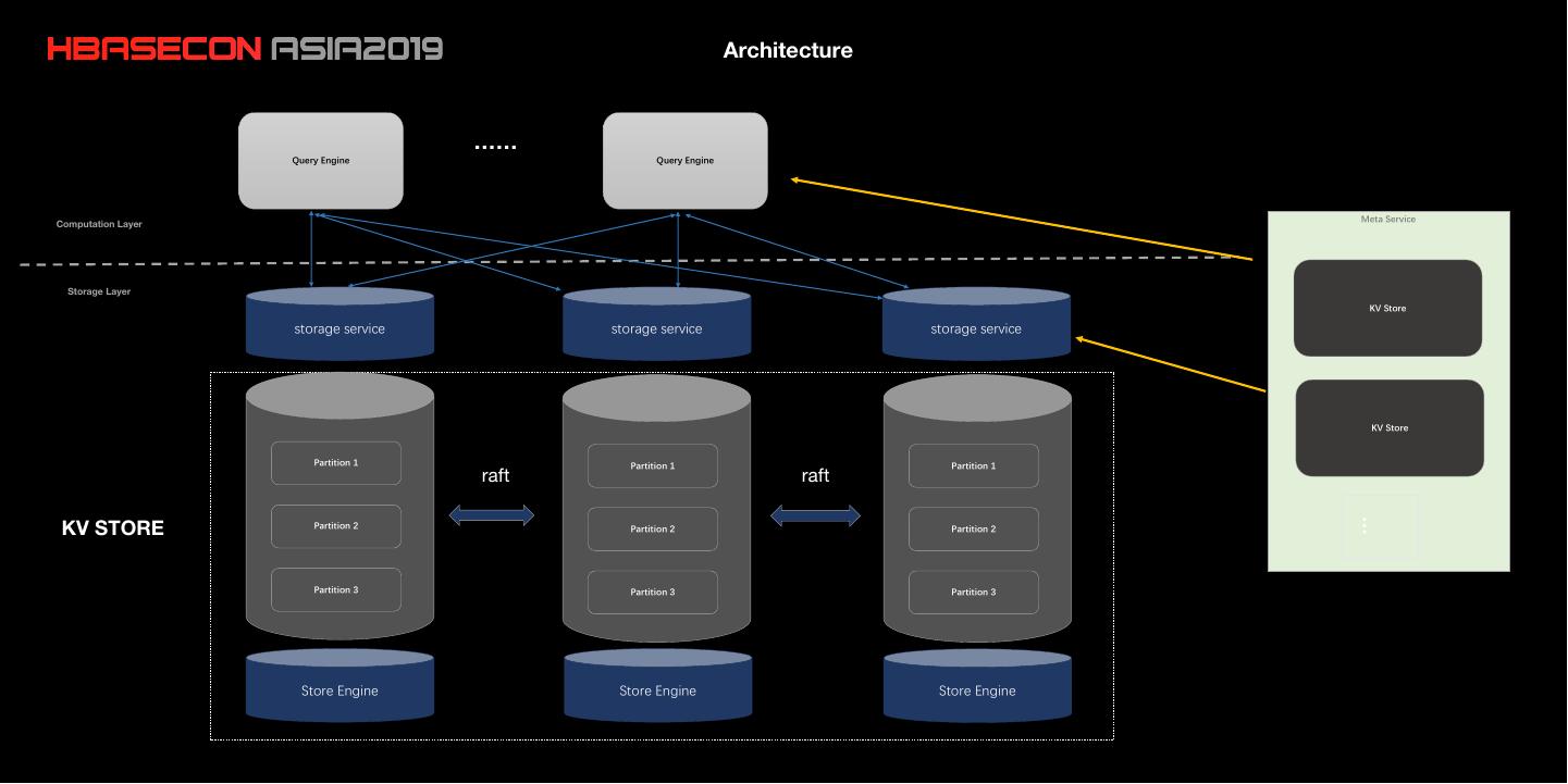 7 . Architecture …… Query Engine Query Engine Meta Service Computation Layer Storage Layer KV Store storage service storage service storage service KV Store Partition 1 Partition 1 Partition 1 raft raft KV STORE … Partition 2 Partition 2 Partition 2 Partition 3 Partition 3 Partition 3 Store Engine Store Engine Store Engine