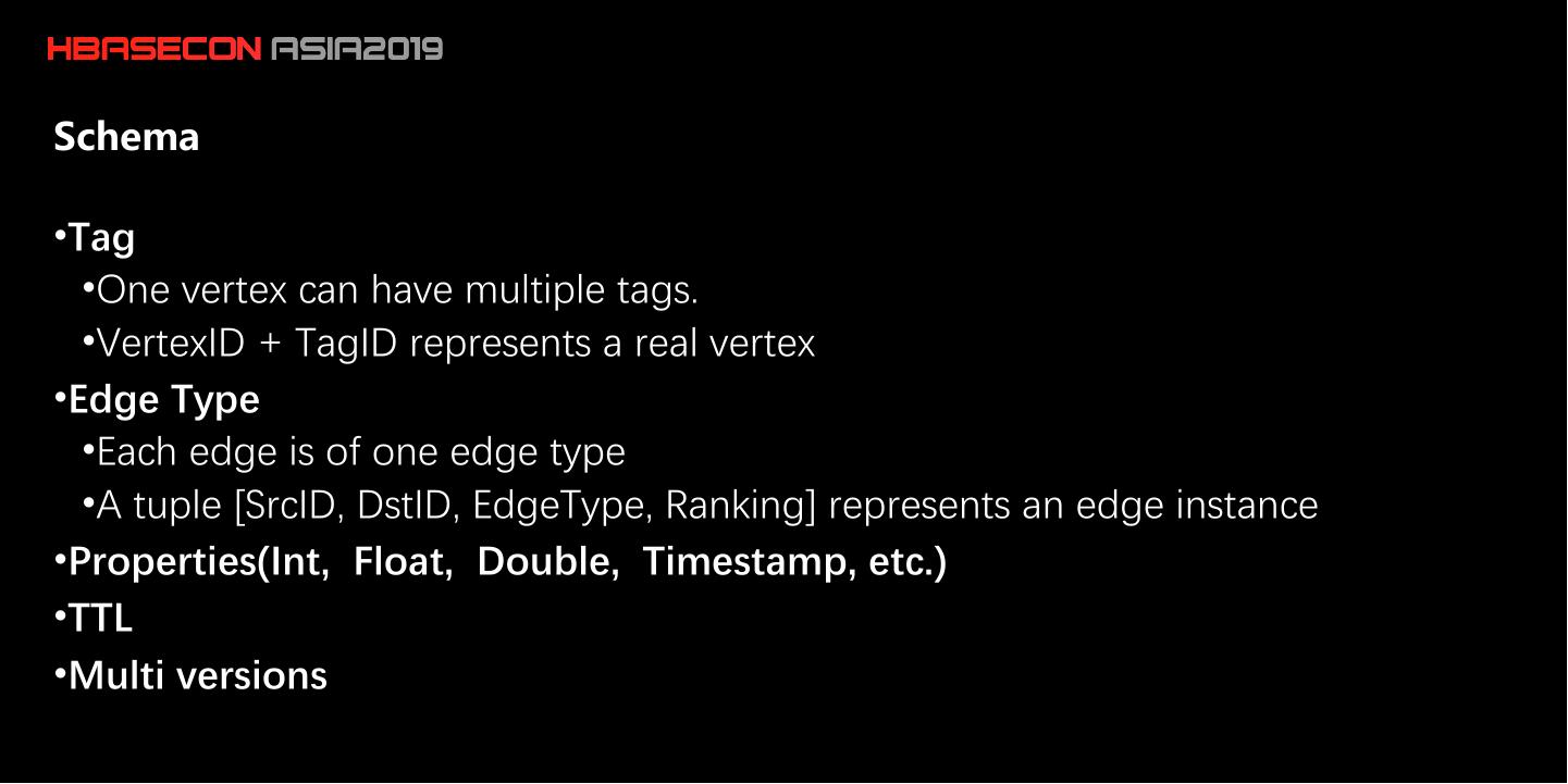 10 .Schema •Tag •One vertex can have multiple tags. •VertexID + TagID represents a real vertex •Edge Type •Each edge is of one edge type •A tuple [SrcID, DstID, EdgeType, Ranking] represents an edge instance •Properties(Int, Float, Double, Timestamp, etc.) •TTL •Multi versions