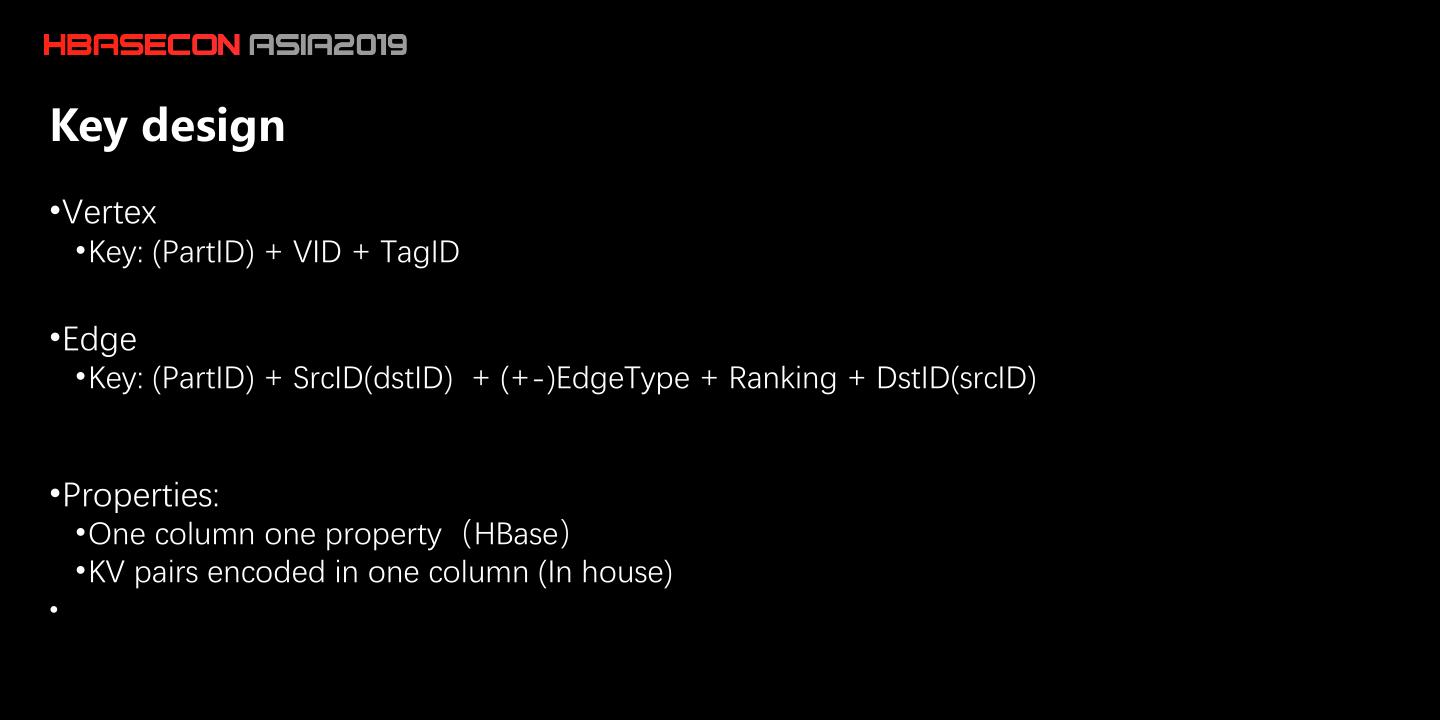 11 .Key design •Vertex •Key: (PartID) + VID + TagID •Edge •Key: (PartID) + SrcID(dstID) + (+-)EdgeType + Ranking + DstID(srcID) •Properties: •One column one property(HBase) •KV pairs encoded in one column (In house) •