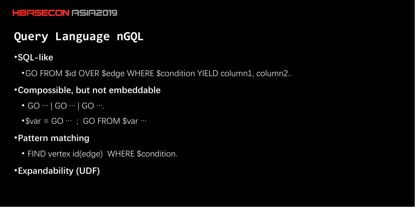 12 .Query Language nGQL •SQL-like •GO FROM $id OVER $edge WHERE $condition YIELD column1, column2.. •Compossible, but not embeddable • GO … | GO … | GO …. •$var = GO … ; GO FROM $var … •Pattern matching • FIND vertex id(edge) WHERE $condition. •Expandability (UDF)