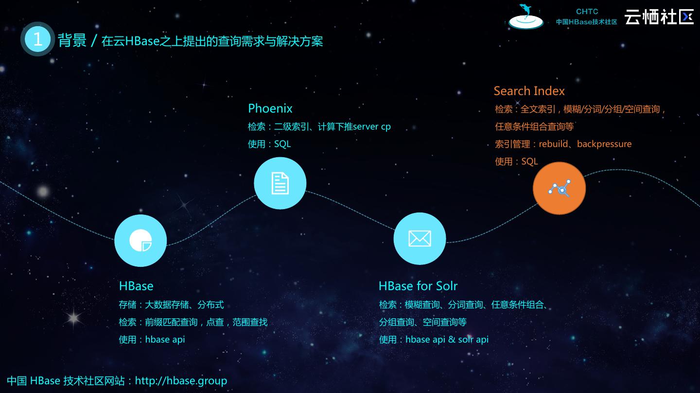 5 . ' 背景 / 在云50Fsevk提出的查询需求n解决方案 ;hSeRNx 检索h{级索引、计算l推server HT 使用hSQL 50Fse 50Fse KSr SSPr 存储h大数据存储、分布式 检索h模糊查询、分词查询、任意条件组合、 检索h前缀匹配查询g点查g范围查找 分组查询、空间查询等 使用hhbFse FTN 使用hhbFse FTN sSPr FTN s国 50Fse 技术社区网站hhXXT,//hbFse.LrSYT
