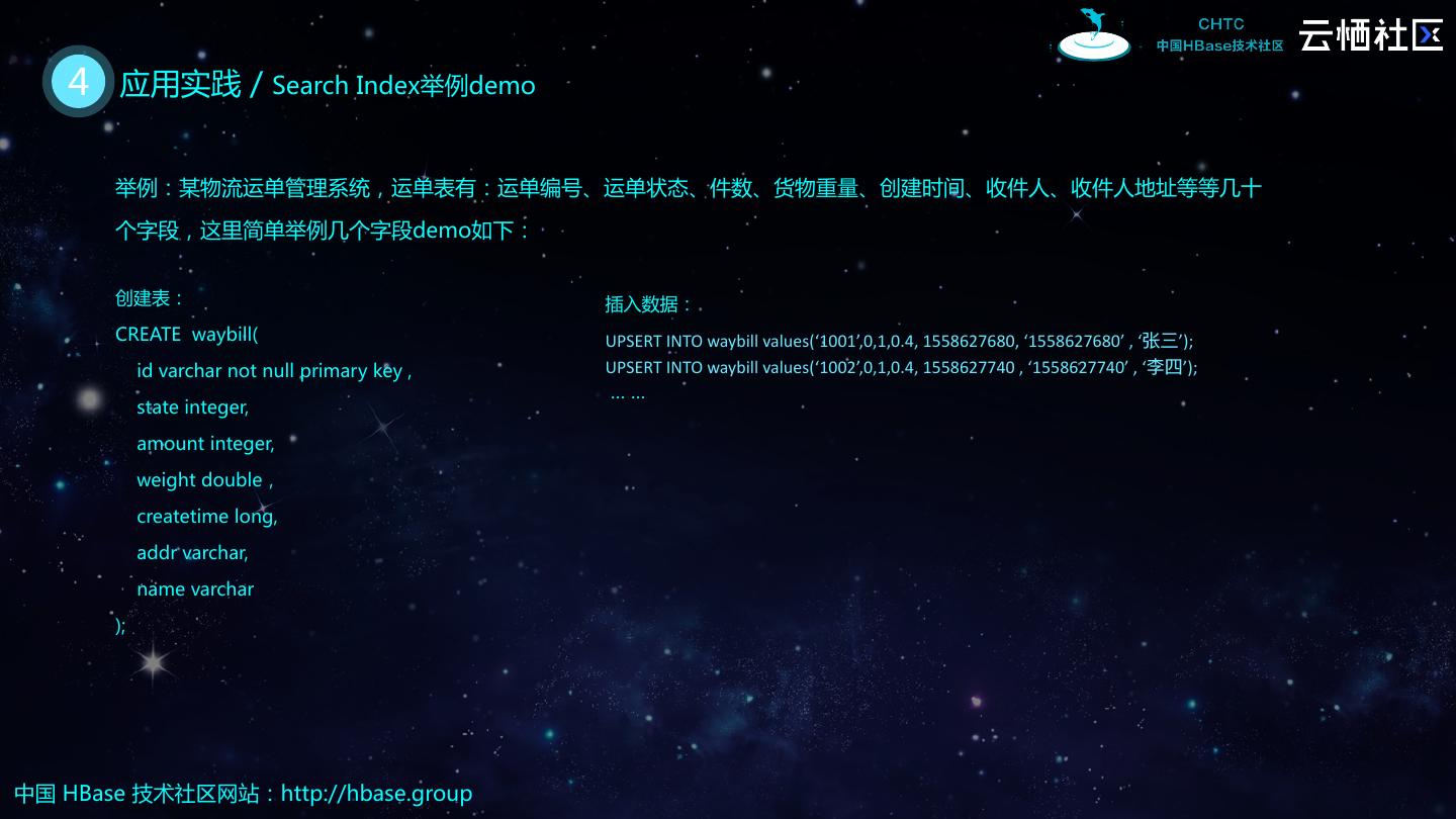 18 . * 应用实践 / SeFrHh IRIexu例IeQS u例h某物流运单管理系统g运单表有h运单编号、运单状态、件数、货物重量、创建时间、收件}、收件}地址等等几十 r字段g这里简单u例几r字段IeQS如lh 创建表h 插入数据h 1=3/T3 [F]bNPP( UPSERT INTO waybill values(‘1001’,0,1,0.4, 1558627680, ‘1558627680’ , ‘ୟӣ’); NI vFrHhFr RSX RYPP TrNQFr] Oe] , UPSERT INTO waybill values(‘1002’,0,1,0.4, 1558627740 , ‘1558627740’ , ‘ࢥ’); ff sXFXe NRXeLer, FQSYRX NRXeLer, [eNLhX ISYbPeg HreFXeXNQe PSRL, FIIr vFrHhFr, RFQe vFrHhFr ); s国 50Fse 技术社区网站hhXXT,//hbFse.LrSYT