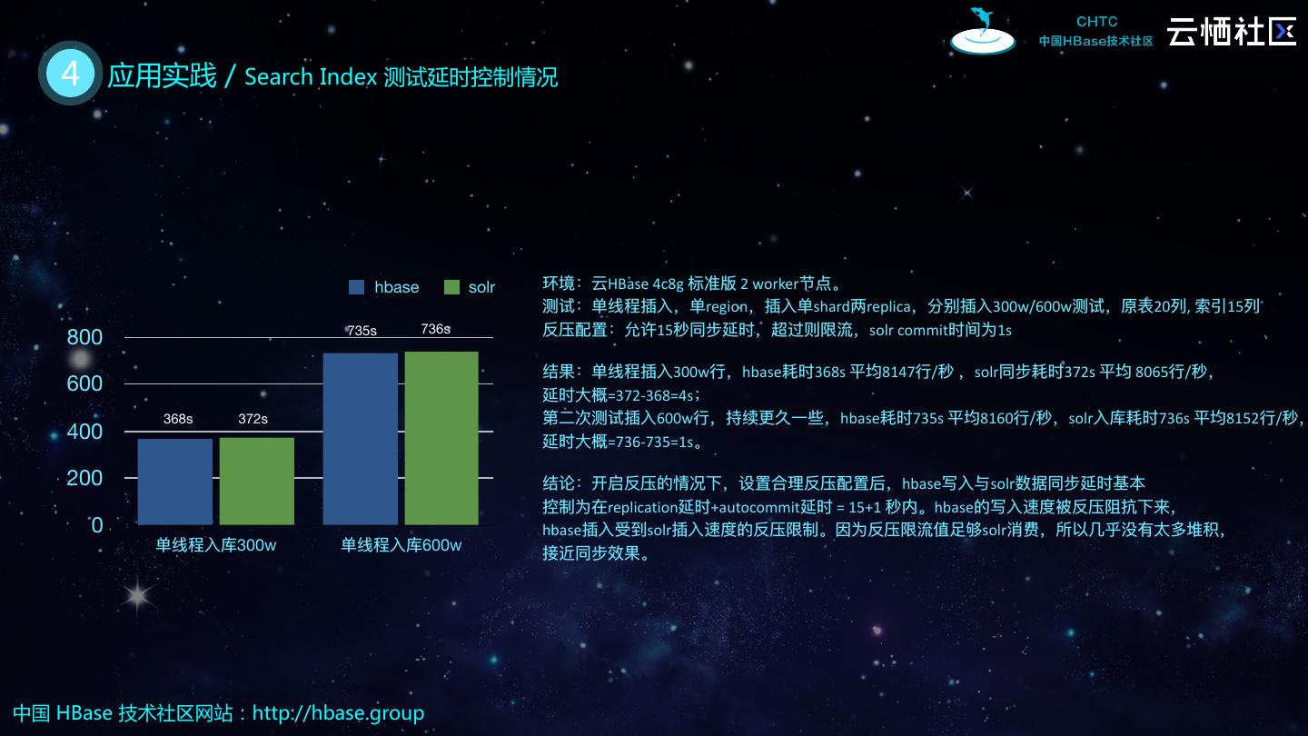 20 . * 应用实践 / SeFrHh IRIex 测试延时控制情况 hbase solr ሾहғԯHBase 4c8g ຽٵᇇ 2 workerᜓᅩ̶ ၥᦶғܔᕚᑕൊܔ҅فregion҅ൊܔفshardӷreplica҅ڦړൊف300w/600wၥᦶܻ҅ᤒ20ڜ, ᔱ15 ڜ 735s 736s ܴݍᯈᗝғ꧋ᦜ15ᑁྍݶ҅᩻ᬦڞᴴၞ҅solr commitᳵԅ1s 800 ᕮຎғܔᕚᑕൊف300wᤈ҅hbaseᘙ368s ଘ࣐8147ᤈ/ᑁ ҅solrྍݶᘙ372s ଘ࣐ 8065ᤈ/ᑁ҅ 600 य़༷=372-368=4sҔ 368s 372s ᒫԫེၥᦶൊف600wᤈ҅೮ᖅๅԋӞԶ҅hbaseᘙ735s ଘ࣐8160ᤈ/ᑁ҅solrفପᘙ736s ଘ࣐8152ᤈ/ᑁ҅ 400 य़༷=736-735=1s̶ 200 ᕮᦞғܴݍސጱఘ٭ӥ҅ᦡᗝݳቘܴݍᯈᗝ҅ݸhbaseٟفӨsolrහഝྍݶच ഴګԅࣁreplication+autocommit = 15+1 ᑁ̶ٖhbaseጱٟف᭛ଶᤩܴݍᴥಯӥ҅ 0 hbaseൊکݑفsolrൊف᭛ଶጱܴݍᴴࢩ̶ګԅܴݍᴴၞ꧊᪃ड़solrၾᩇ҅ಅզپԒဌํॡग़ञᑌ҅ ܔᕚᑕفପ300w ܔᕚᑕفପ600w ളᬪྍݶපຎ̶ s国 50Fse 技术社区网站hhXXT,//hbFse.LrSYT
