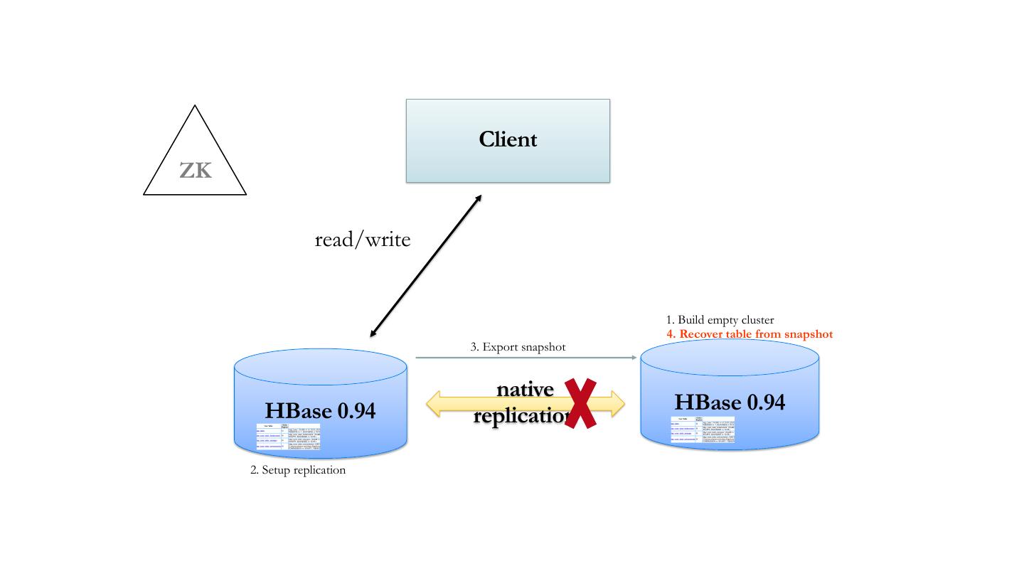 19 . Client ZK read/write 1. Build empty cluster 4. Recover table from snapshot 3. Export snapshot native HBase 0.94 HBase 0.94 replication 2. Setup replication