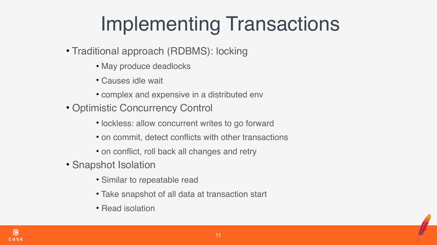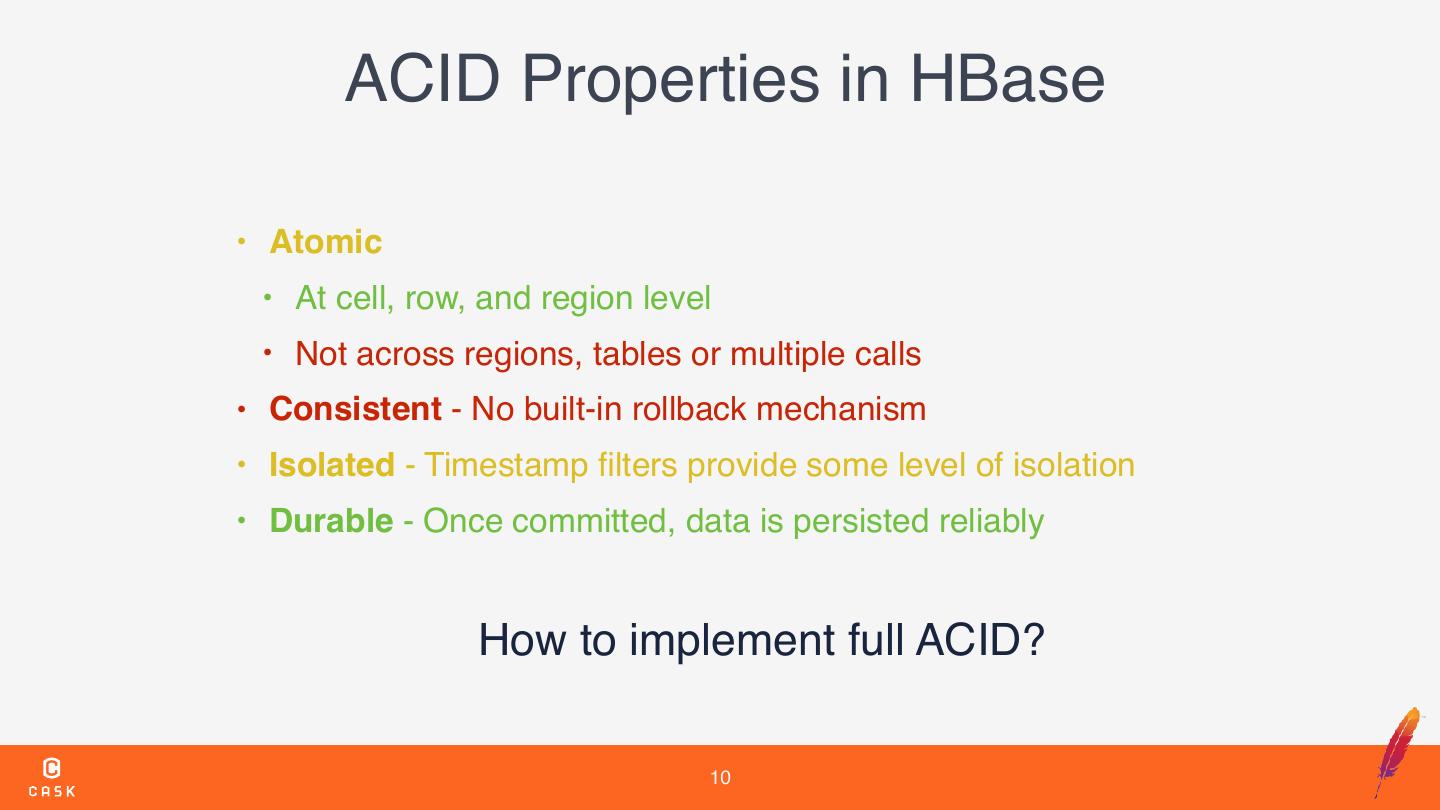 10 . ACID Properties in HBase • Atomic • At cell, row, and region level • Not across regions, tables or multiple calls • Consistent - No built-in rollback mechanism • Isolated - Timestamp filters provide some level of isolation • Durable - Once committed, data is persisted reliably How to implement full ACID? 10