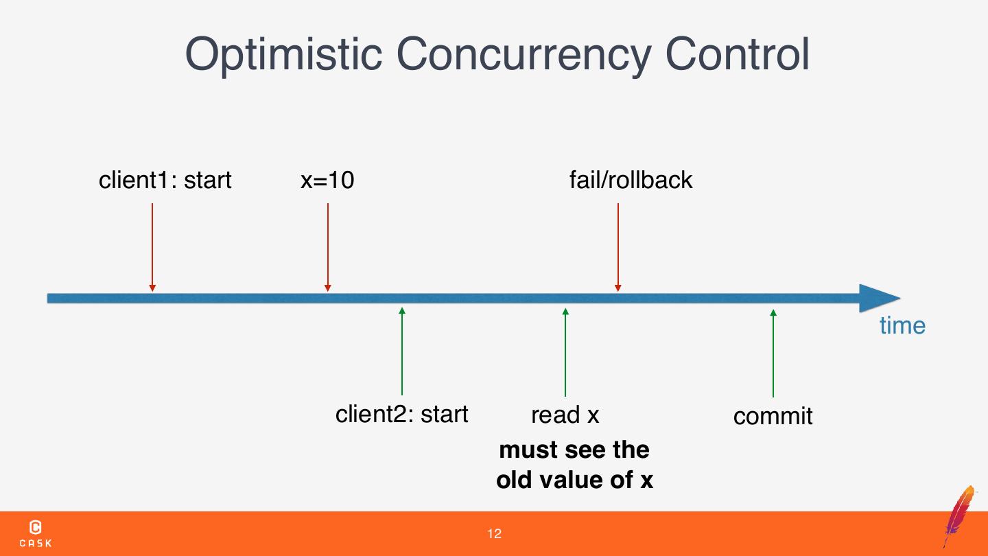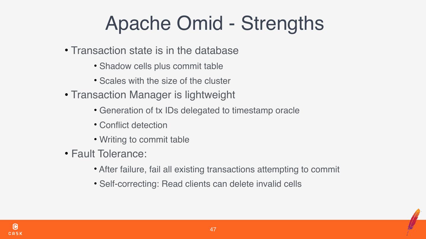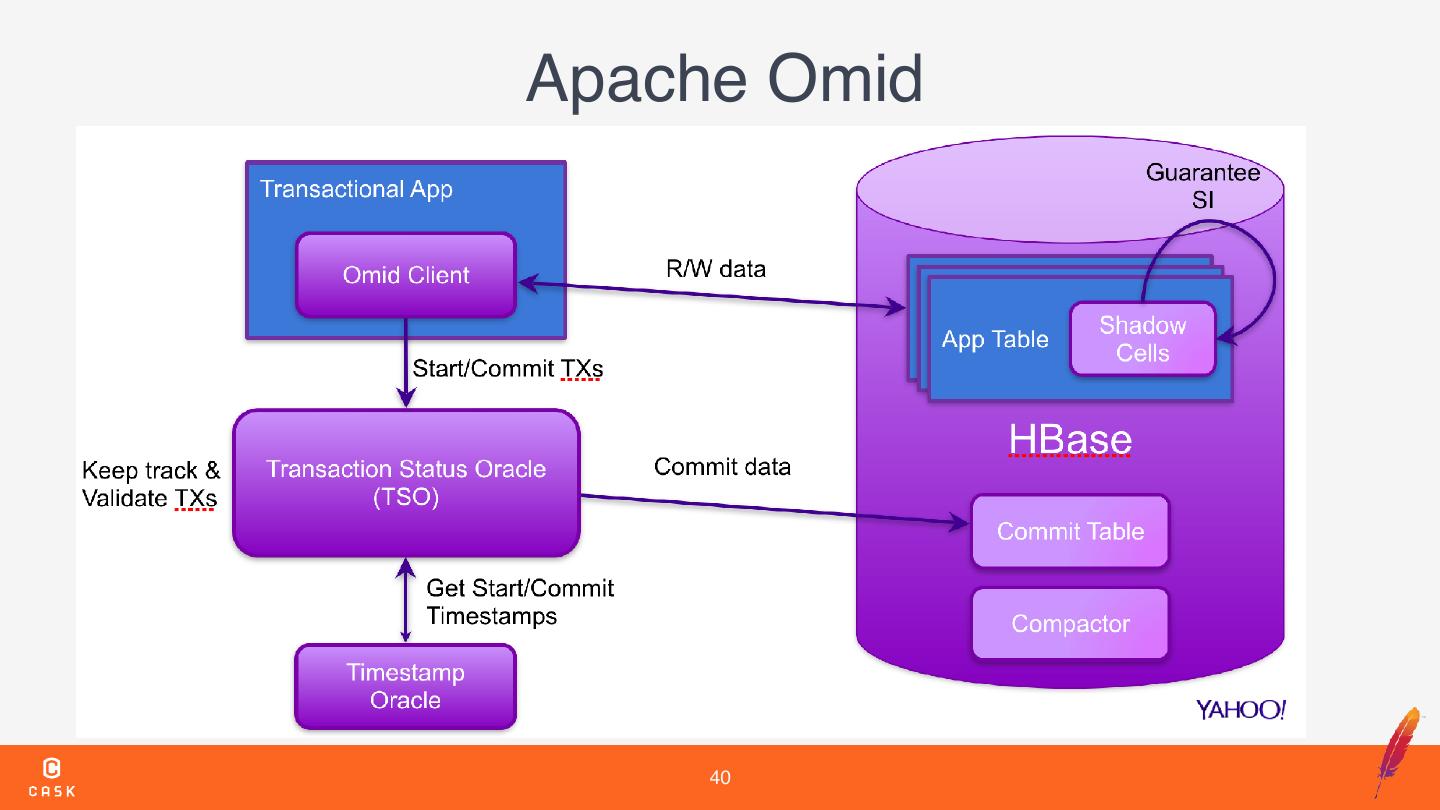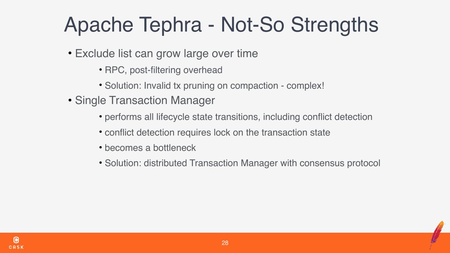 23 . In Common • Optimistic Concurrency Control must: • maintain Transaction State: • what tx are in flight and committed? • what is the change set of each tx? (for conflict detection, rollback) • what transactions are invalid (failed to roll back due to crash etc.) • generate unique transaction IDs • coordinate the life cycle of a transaction • start, detect conflicts, commit, rollback • All of { Omid, Tephra, Trafodion } implement this • but vary in how they do it 17