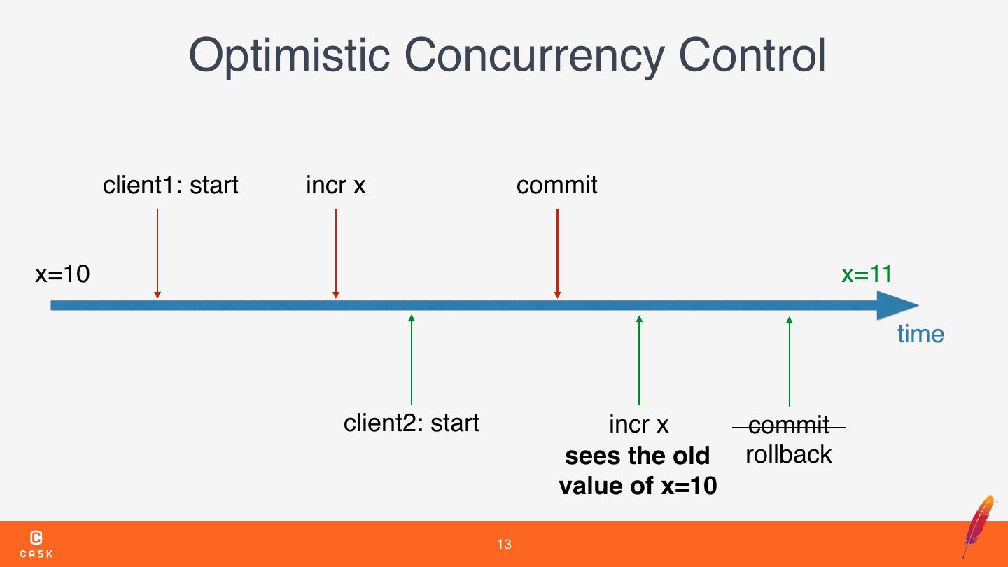 13 . Optimistic Concurrency Control client1: start incr x commit x=10 x=11 time client2: start incr x commit sees the old rollback value of x=10 13