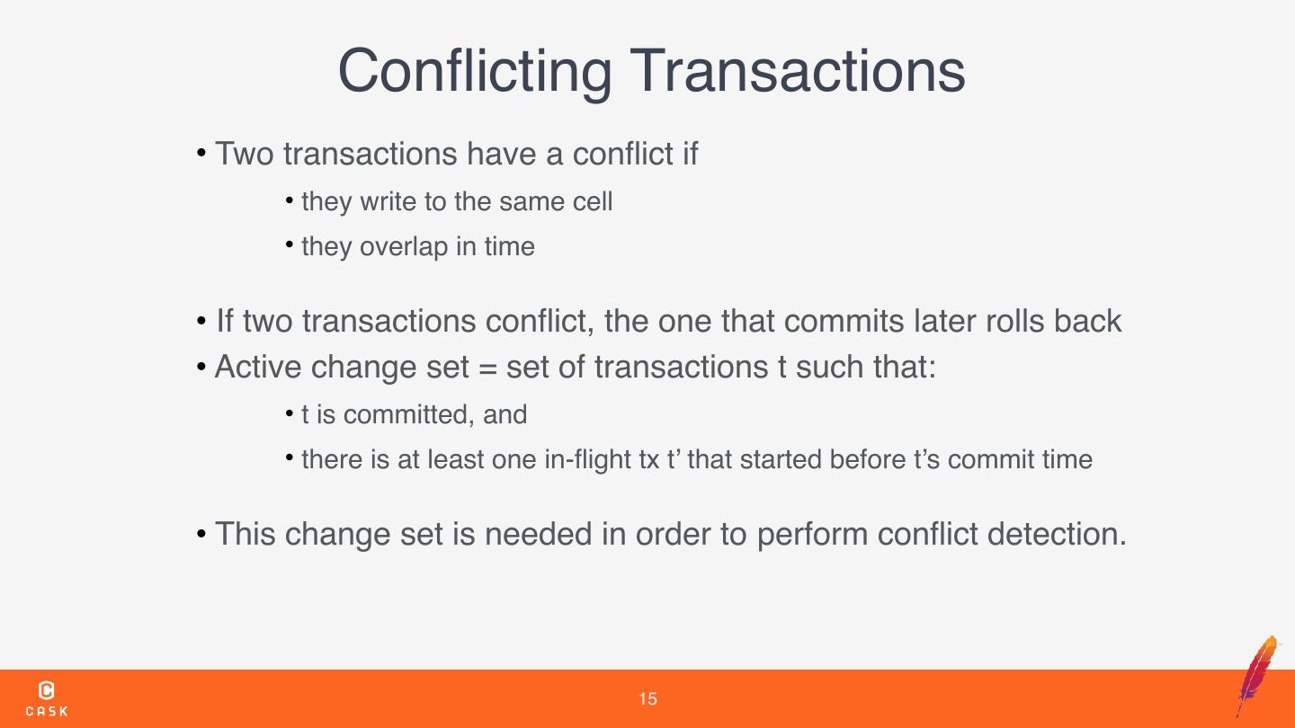 21 . Conflicting Transactions • Two transactions have a conflict if • they write to the same cell • they overlap in time • If two transactions conflict, the one that commits later rolls back • Active change set = set of transactions t such that: • t is committed, and • there is at least one in-flight tx t’ that started before t’s commit time • This change set is needed in order to perform conflict detection. 15