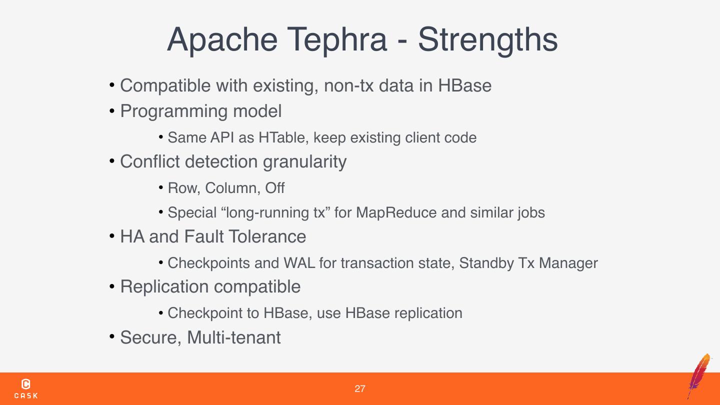 24 . Apache Tephra • Based on the original Omid paper: Daniel Gómez Ferro, Flavio Junqueira, Ivan Kelly, Benjamin Reed, Maysam Yabandeh: Omid: Lock-free transactional support for distributed data stores. ICDE 2014. • Transaction Manager: • Issues unique, monotonic transaction IDs • Maintains the set of excluded (in-flight and invalid) transactions • Maintains change sets for active transactions • Performs conflict detection • Client: • Uses transaction ID as timestamp for writes • Filters excluded transactions for isolation • Performs rollback 18