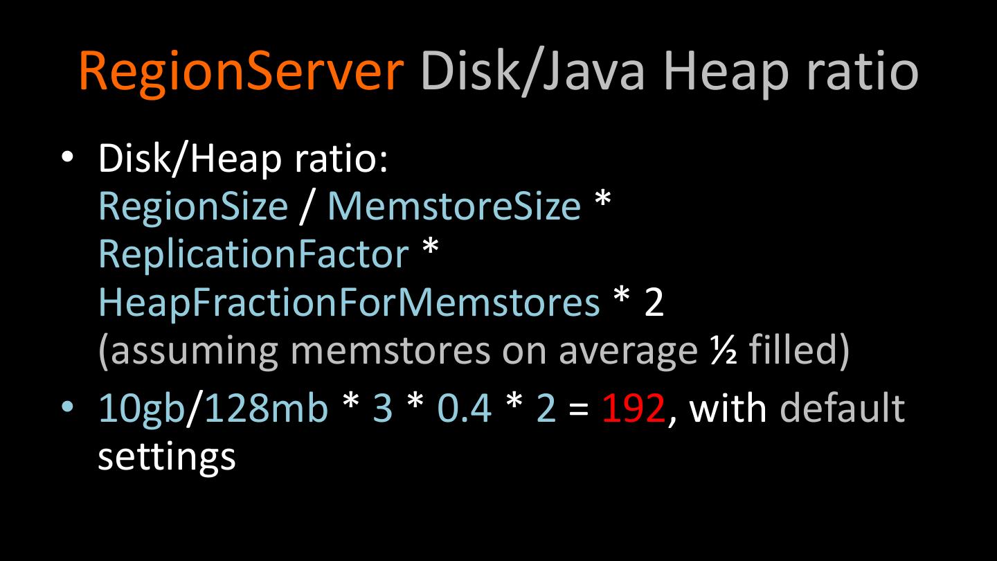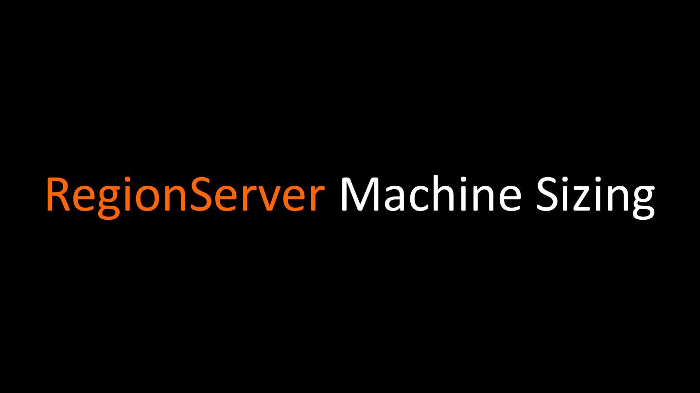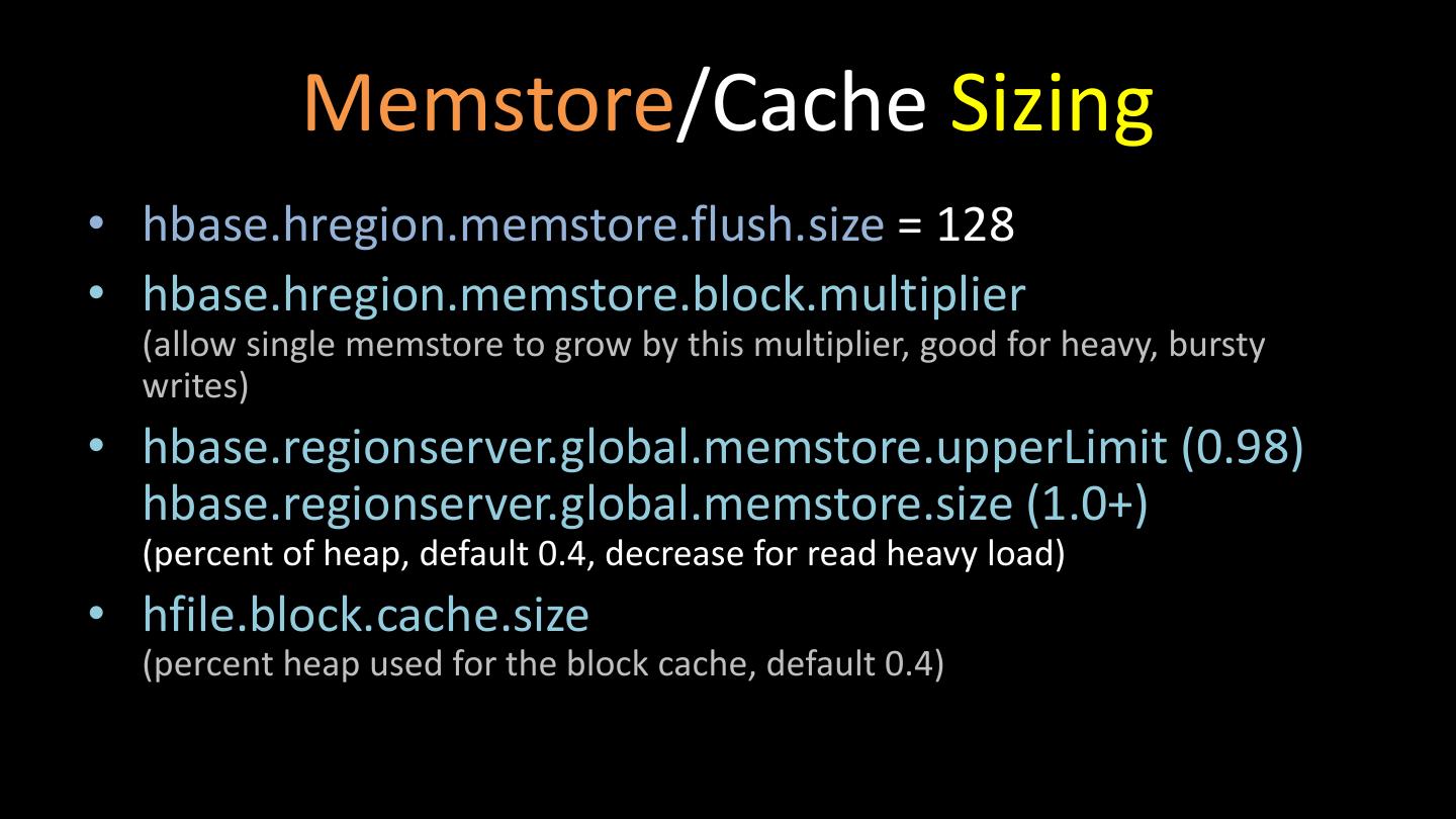 24 . Memstore/Cache Sizing • hbase.hregion.memstore.flush.size = 128 • hbase.hregion.memstore.block.multiplier (allow single memstore to grow by this multiplier, good for heavy, bursty writes) • hbase.regionserver.global.memstore.upperLimit (0.98) hbase.regionserver.global.memstore.size (1.0+) (percent of heap, default 0.4, decrease for read heavy load) • hfile.block.cache.size (percent heap used for the block cache, default 0.4)
