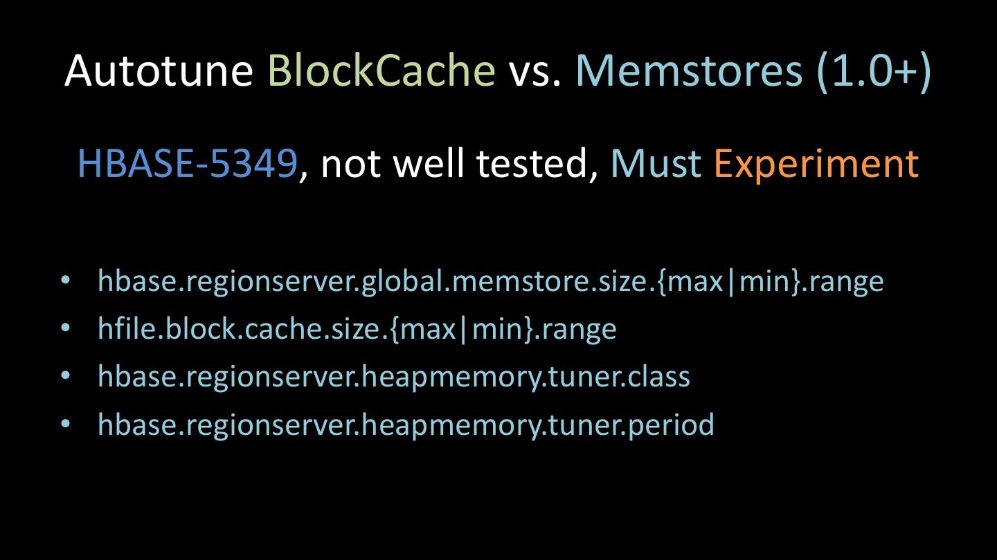 25 .Autotune BlockCache vs. Memstores (1.0+) HBASE-5349, not well tested, Must Experiment • hbase.regionserver.global.memstore.size.{max|min}.range • hfile.block.cache.size.{max|min}.range • hbase.regionserver.heapmemory.tuner.class • hbase.regionserver.heapmemory.tuner.period