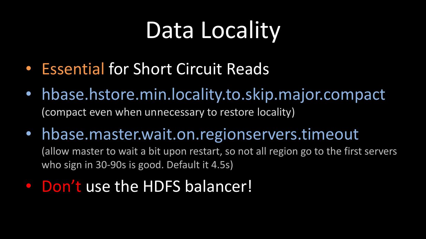 26 . Data Locality • Essential for Short Circuit Reads • hbase.hstore.min.locality.to.skip.major.compact (compact even when unnecessary to restore locality) • hbase.master.wait.on.regionservers.timeout (allow master to wait a bit upon restart, so not all region go to the first servers who sign in 30-90s is good. Default it 4.5s) • Don’t use the HDFS balancer!