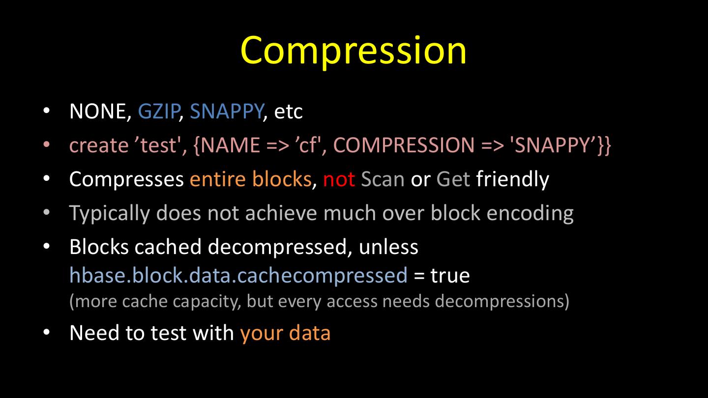 29 . Compression • NONE, GZIP, SNAPPY, etc • create ’test', {NAME => ’cf', COMPRESSION => 'SNAPPY’}} • Compresses entire blocks, not Scan or Get friendly • Typically does not achieve much over block encoding • Blocks cached decompressed, unless hbase.block.data.cachecompressed = true (more cache capacity, but every access needs decompressions) • Need to test with your data