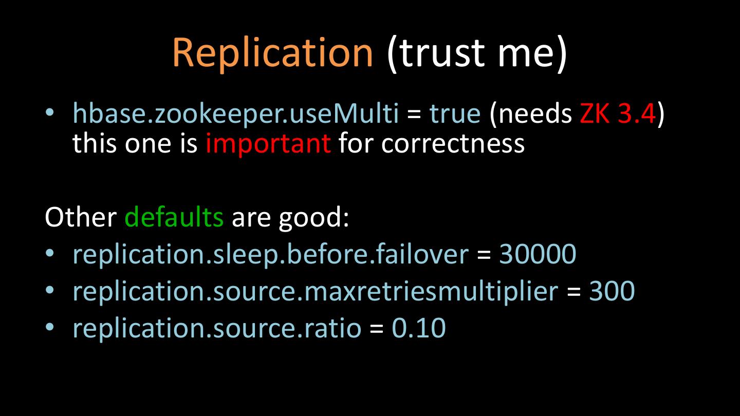 14 . Misc HDFS settings (just trust me on these) • dfs.block.size = 268435456 (note that WAL is rolled at 95% of this) • ipc.server.tcpnodelay = true • ipc.client.tcpnodelay = true