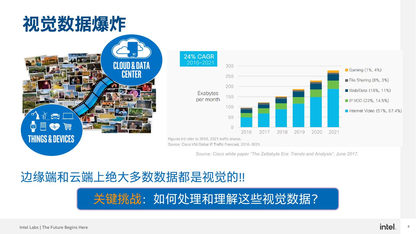 4 .4 视觉数据爆炸 Cloud & DATA Center Things & devices Source: Cisco white paper “The Zettabyte Era: Trends and Analysis”, June 2017. 边缘端和云端上绝大多数数据都是视觉的!! 关键挑战:如何处理和理解这些视觉数据? Intel Labs | The Future Begins Here 4