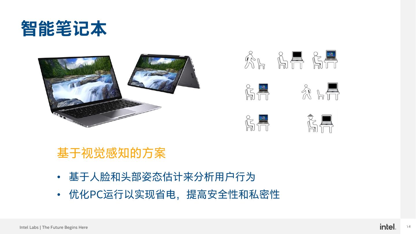 14 .智能笔记本 基于视觉感知的方案 • 基于人脸和头部姿态估计来分析用户行为 • 优化PC运行以实现省电,提高安全性和私密性 Intel Labs | The Future Begins Here 14 14
