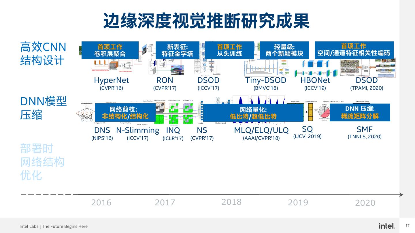 16 .16 议程 • 简介 • 高效CNN算法设计及实际应用 • 深度模型压缩优化及技术落地 • 以人为中心的视觉分析与合成 • 总结及展望 Intel Labs | The Future Begins Here 16