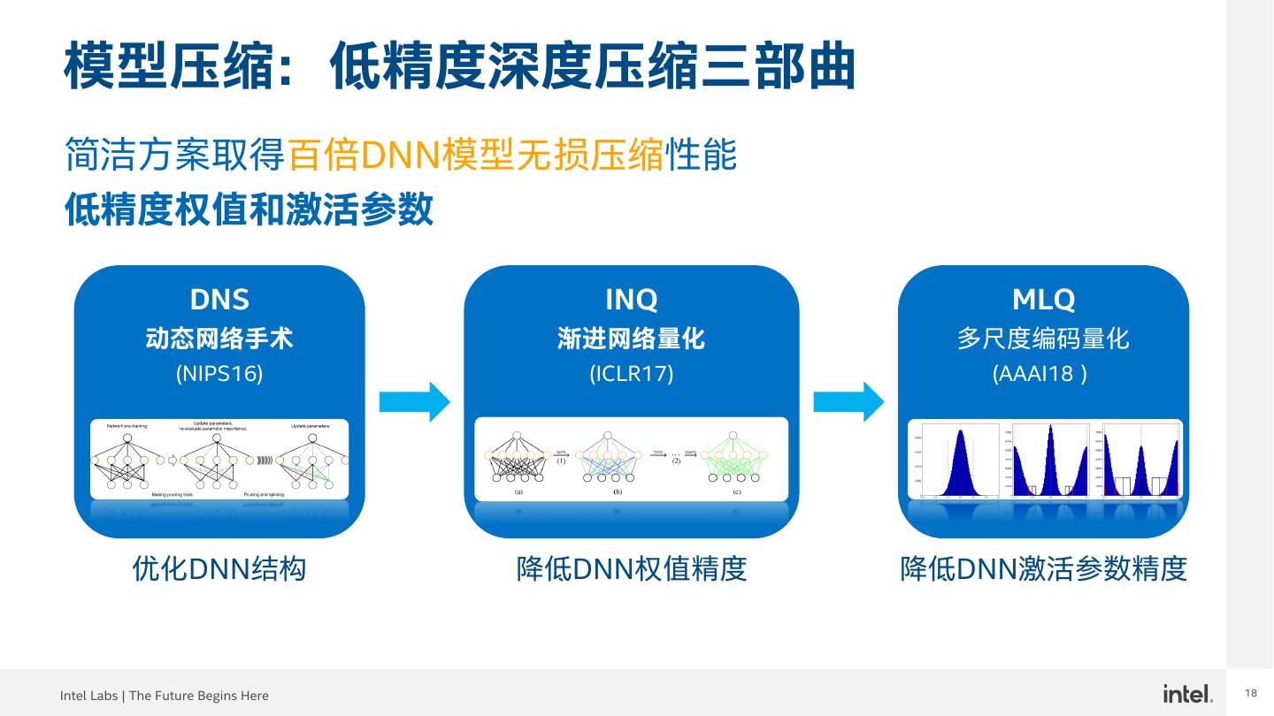 18 .18 模型压缩:低精度深度压缩三部曲 简洁方案取得百倍DNN模型无损压缩性能 低精度权值和激活参数 DNS INQ MLQ 动态网络手术 渐进网络量化 多尺度编码量化 (NIPS16) (ICLR17) (AAAI18) 优化DNN结构 降低DNN权值精度 降低DNN激活参数精度 Intel Labs | The Future Begins Here 18