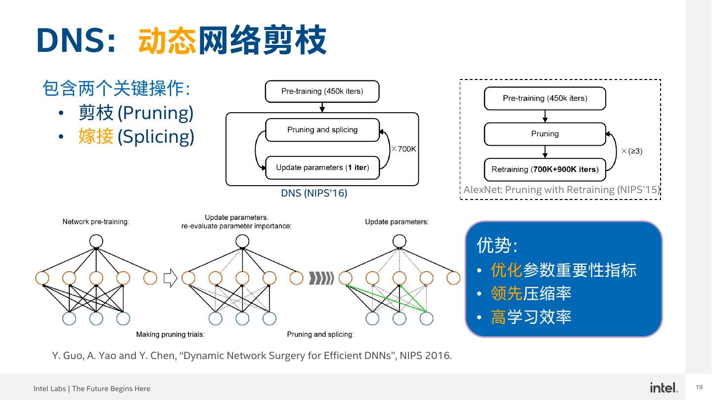 19 .19 DNS:动态网络剪枝 包含两个关键操作: • 剪枝 (Pruning) • 嫁接 (Splicing) DNS (NIPS’16) AlexNet: Pruning with Retraining (NIPS’15) 优势: • 优化参数重要性指标 • 领先压缩率 • 高学习效率 Y. Guo, A. Yao and Y. Chen, “Dynamic Network Surgery for Efficient DNNs”, NIPS 2016. Intel Labs | The Future Begins Here 19