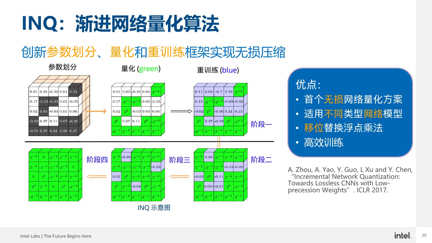 20 .20 INQ:渐进网络量化算法 创新参数划分、量化和重训练框架实现无损压缩 参数划分 量化 (green) 重训练 (blue) 优点: • 首个无损网络量化方案 • 适用不同类型网络模型 阶段一 • 移位替换浮点乘法 • 高效训练 阶段四 阶段三 阶段二 A. Zhou, A. Yao, Y. Guo, L Xu and Y. Chen, “Incremental Network Quantization: Towards Lossless CNNs with Low- precession Weights”. ICLR 2017. INQ 示意图 Intel Labs | The Future Begins Here 20