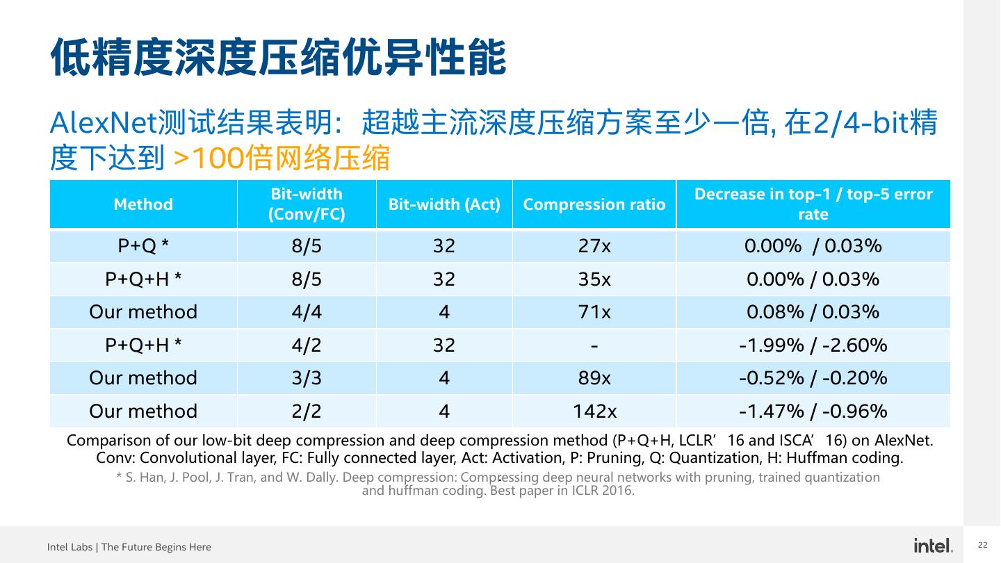 21 .21 INQ效果显著 对于主流DNN网络,5-bit 量化提高识别准确率, 在超低精度(2/3-bit) 时仍可取得接近全精度模型识别准确率 5-bit 量化结果 更低bit量化结果 A. Zhou, A. Yao, Y. Guo, L Xu and Y. Chen, “Incremental Network Quantization: Towards Lossless CNNs with Low-precession Weights”. ICLR 2017. Intel Labs | The Future Begins Here 21