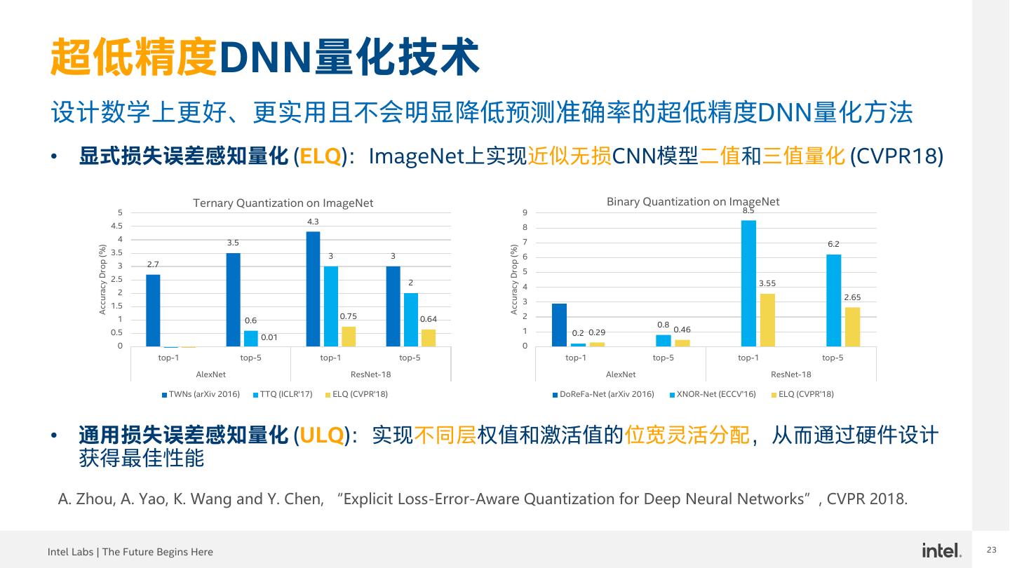22 .22 低精度深度压缩优异性能 AlexNet测试结果表明:超越主流深度压缩方案至少一倍, 在2/4-bit精 度下达到 >100倍网络压缩 Bit-width Decrease in top-1 / top-5 error Method Bit-width (Act) Compression ratio (Conv/FC) rate P+Q * 8/5 32 27x 0.00% / 0.03% P+Q+H * 8/5 32 35x 0.00% / 0.03% Our method 4/4 4 71x 0.08% / 0.03% P+Q+H * 4/2 32 - -1.99% / -2.60% Our method 3/3 4 89x -0.52% / -0.20% Our method 2/2 4 142x -1.47% / -0.96% Comparison of our low-bit deep compression and deep compression method (P+Q+H, LCLR’16 and ISCA’16) on AlexNet. Conv: Convolutional layer, FC: Fully connected layer, Act: Activation, P: Pruning, Q: Quantization, H: Huffman coding. . * S. Han, J. Pool, J. Tran, and W. Dally. Deep compression: Compressing deep neural networks with pruning, trained quantization and huffman coding. Best paper in ICLR 2016. Intel Labs | The Future Begins Here 22