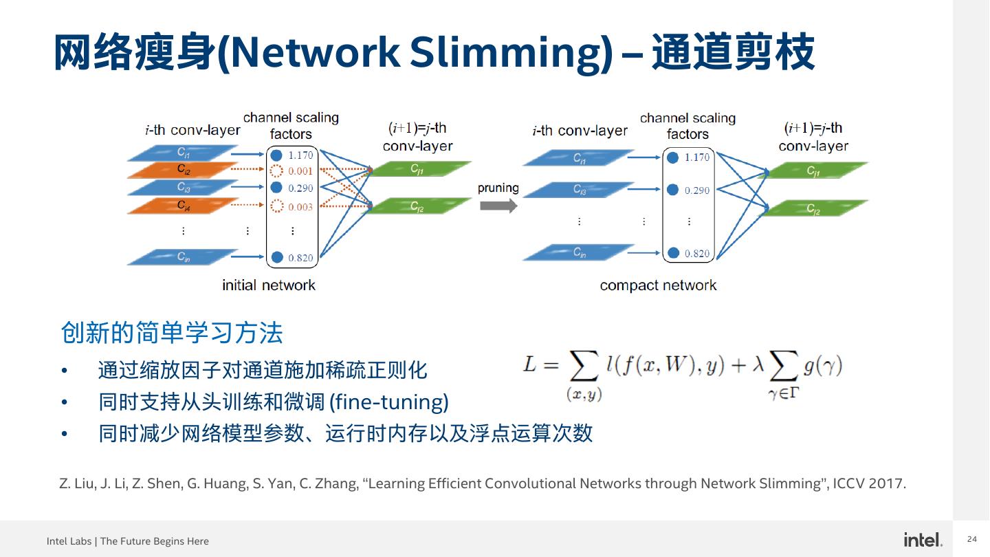 24 .24 网络瘦身(Network Slimming) – 通道剪枝 创新的简单学习方法 • 通过缩放因子对通道施加稀疏正则化 • 同时支持从头训练和微调 (fine-tuning) • 同时减少网络模型参数、运行时内存以及浮点运算次数 Z. Liu, J. Li, Z. Shen, G. Huang, S. Yan, C. Zhang, “Learning Efficient Convolutional Networks through Network Slimming”, ICCV 2017. Intel Labs | The Future Begins Here 24