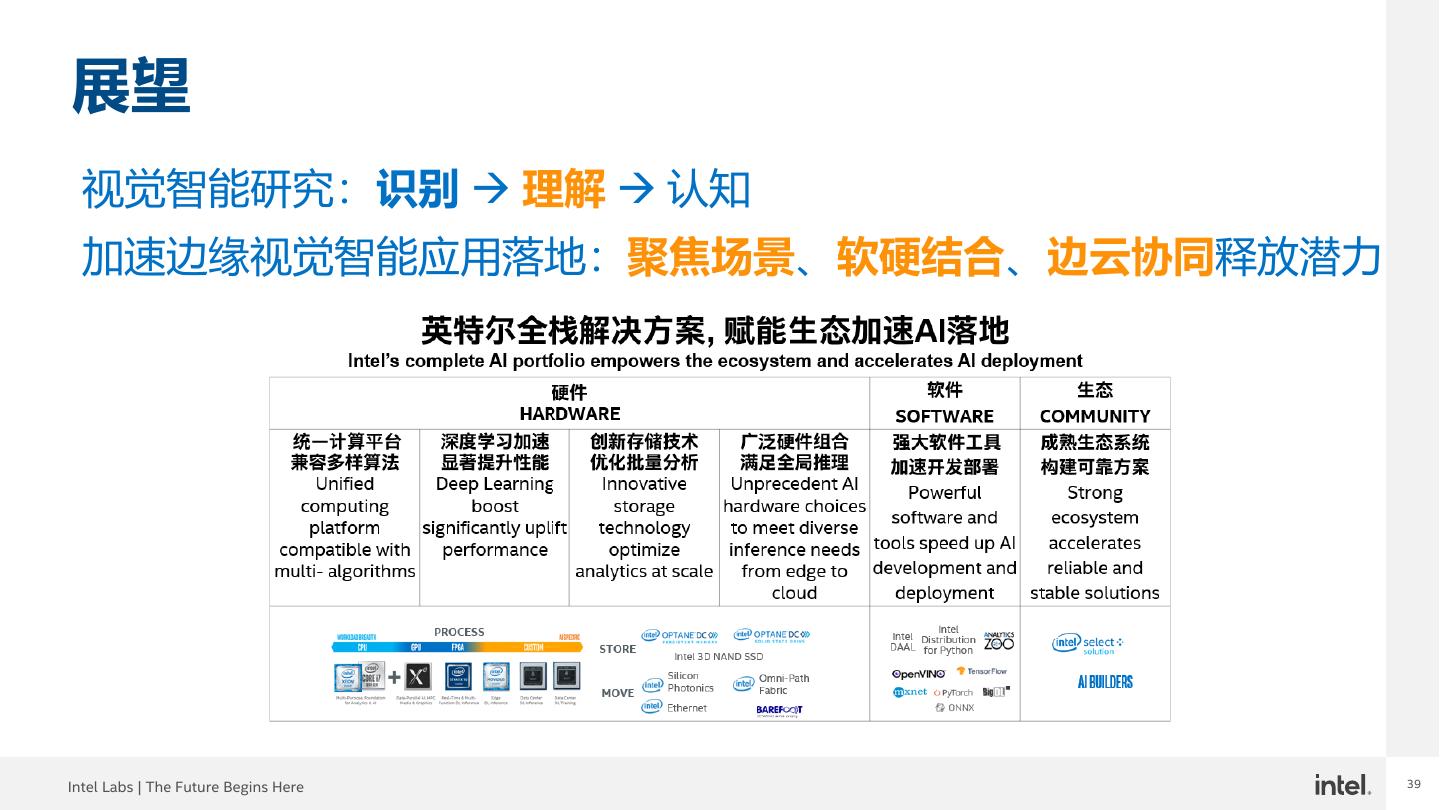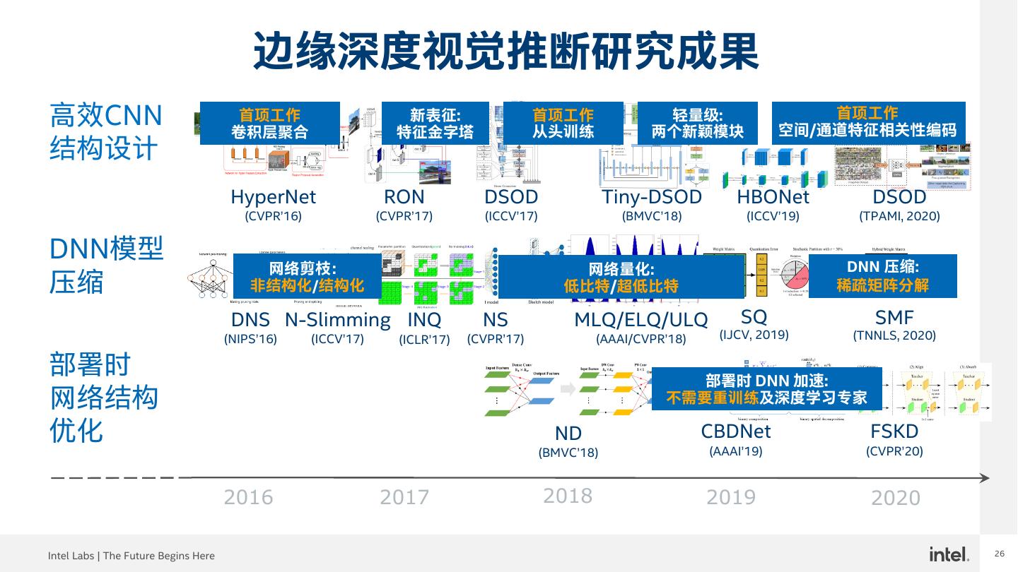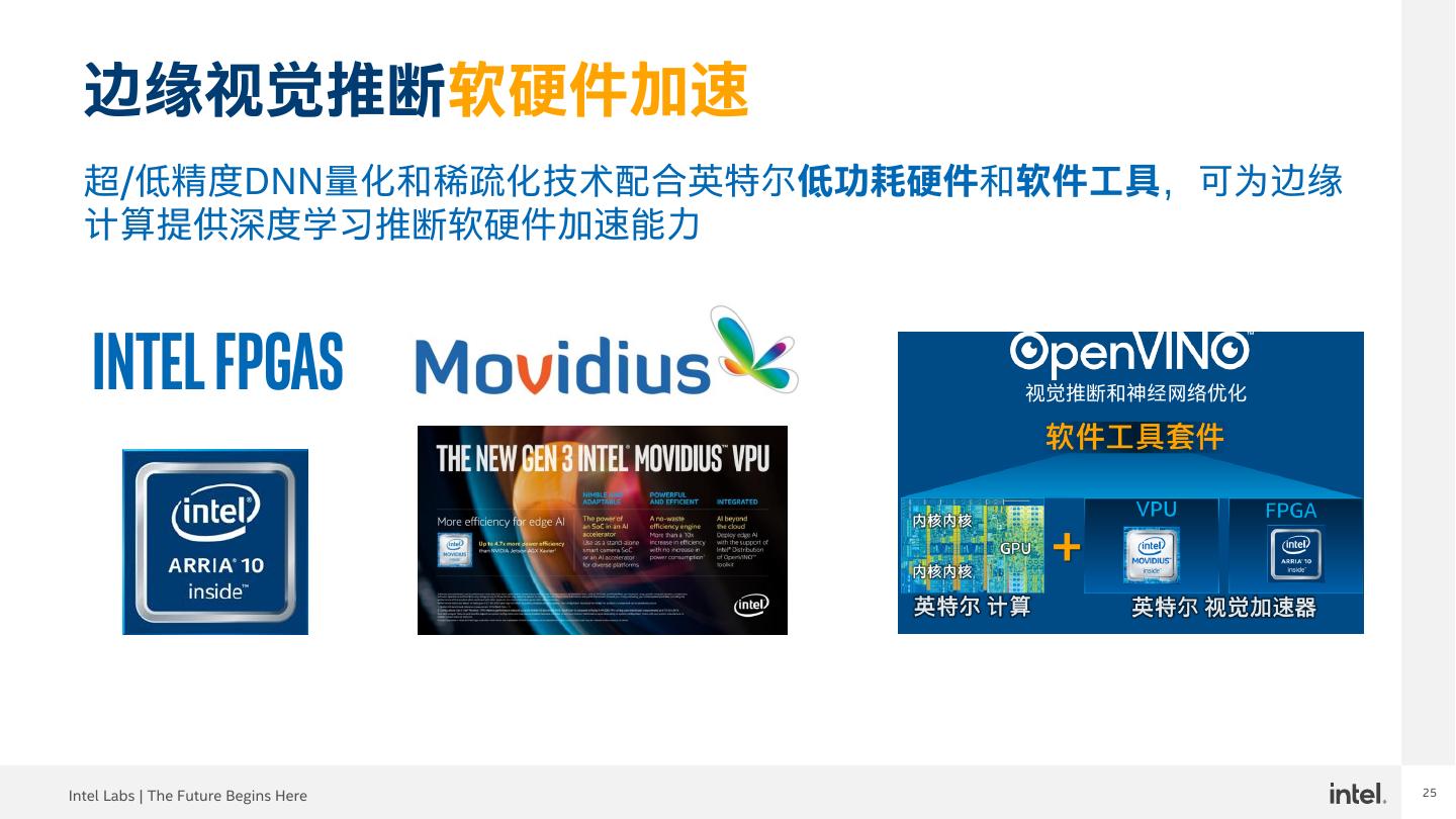 25 .25 边缘视觉推断软硬件加速 超/低精度DNN量化和稀疏化技术配合英特尔低功耗硬件和软件工具,可为边缘 计算提供深度学习推断软硬件加速能力 Intel FPGAs 视觉推断和神经网络优化 Intel Labs | The Future Begins Here 25