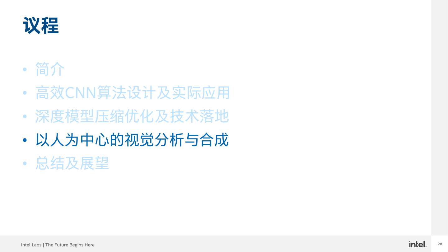 28 .28 议程 • 简介 • 高效CNN算法设计及实际应用 • 深度模型压缩优化及技术落地 • 以人为中心的视觉分析与合成 • 总结及展望 Intel Labs | The Future Begins Here 28