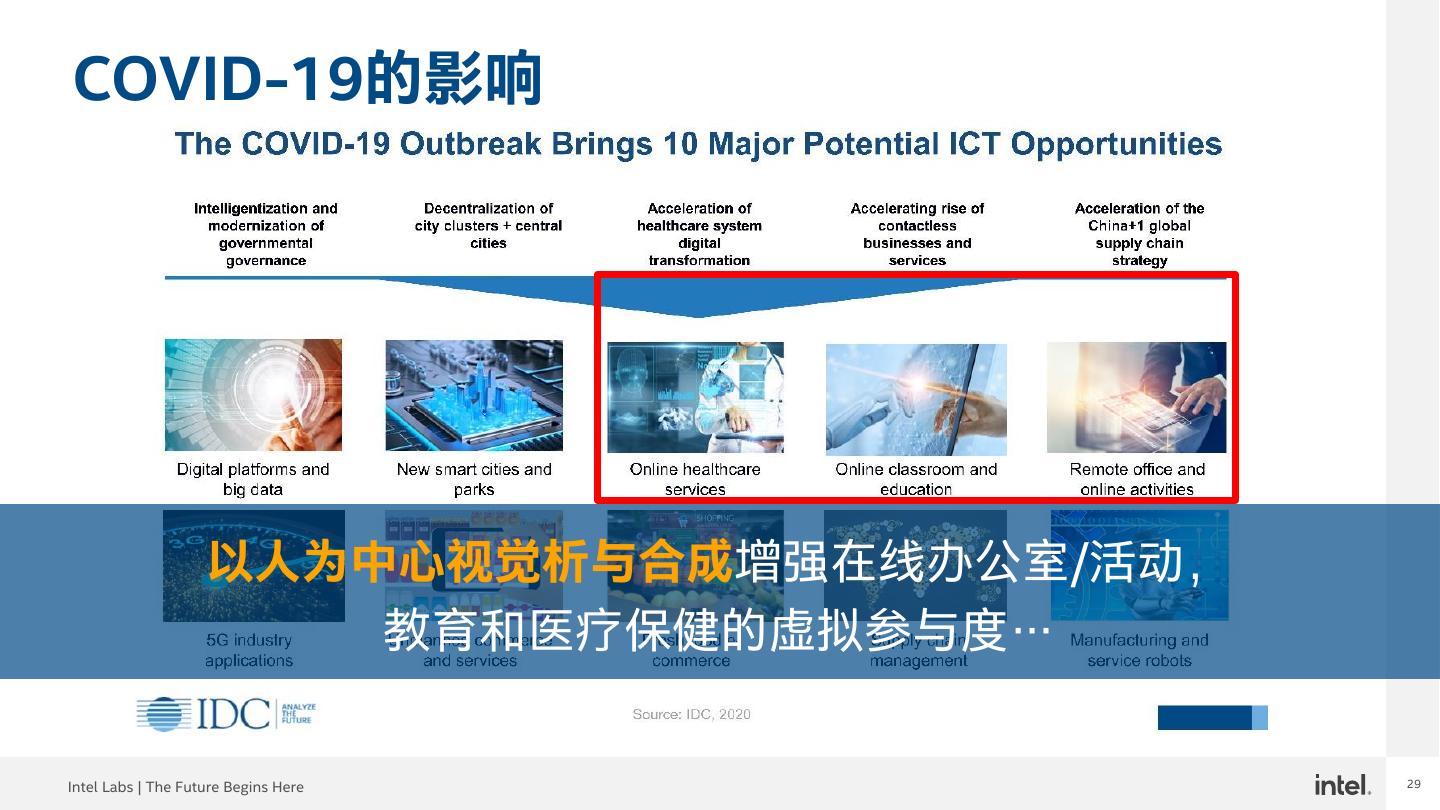 29 .COVID-19的影响 以人为中心视觉析与合成增强在线办公室/活动, 教育和医疗保健的虚拟参与度… Intel Labs | The Future Begins Here 29