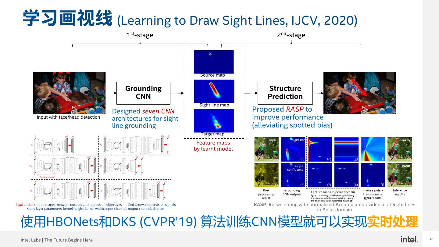 9 .9 DSOD:深度监督物体检测器 首项从头开始训练的物体检测工作 (ICCV17/TPAMI, 2020) • 无需 ImageNet 上百万张图像的预训练 • 只需数万张标注图像 先进准确率和效率 • 模型参数:½ SSD, ¼ R-FCN, 1/10 Faster-RCNN • 准确率比SSD/YOLOv2好 (PASCAL VOC/MS COCO) • 速度:20fps (GPU,无特殊代码优化) 物体检测器设计更多可能性 • 针对特定问题的有限数据集训练 • 其它领域,如深度、医学、多光谱图像网络设计 Z. Shen, Z. Liu, J. Li, Y. Jiang, Y. Chen, X. Xue, “DSOD: Learning Deeply Supervised Object Detectors from Scratch”, ICCV 2017. Z. Shen, Z. Liu, J. Li, Y. Jiang, Y. Chen, X. Xue, “Object Detection from Scratch with Deep Supervision”, TPAMI, Feb 2020. Intel Labs | The Future Begins Here 9