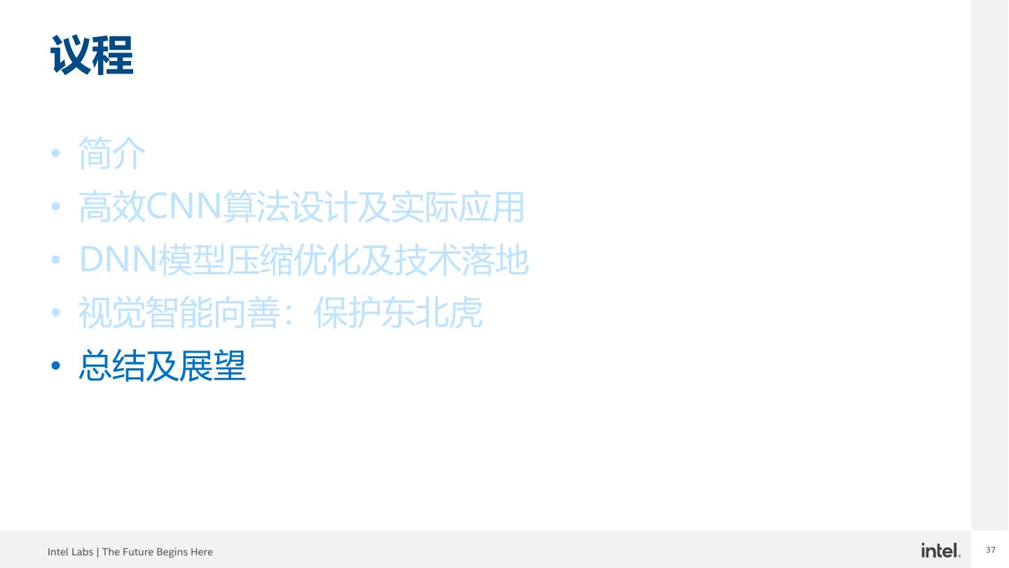 7 .7 议程 • 简介 • 高效CNN算法设计及实际应用 • 深度模型压缩优化及技术落地 • 以人为中心的视觉分析与合成 • 总结及展望 Intel Labs | The Future Begins Here 7