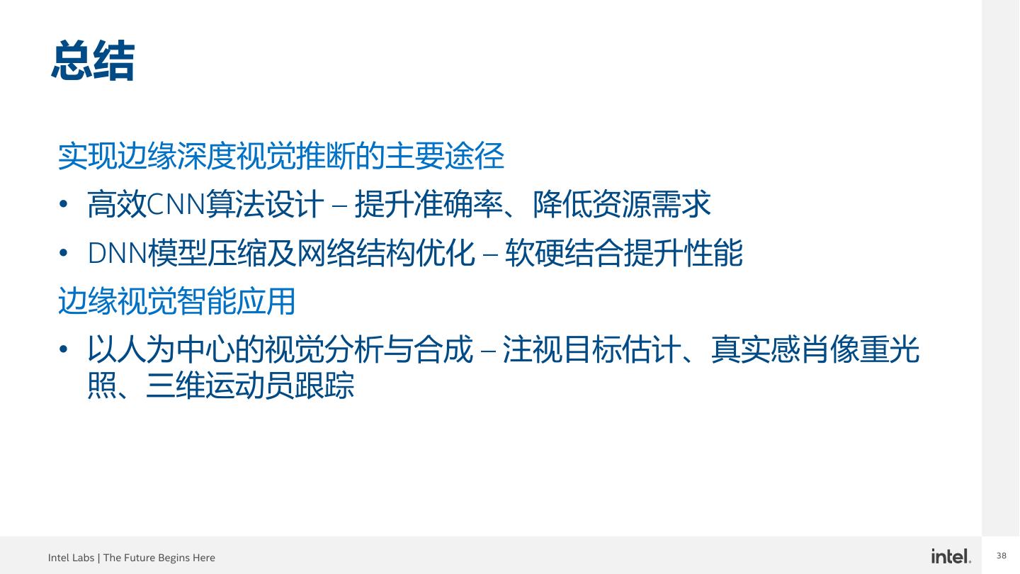 17 .17 边缘深度视觉推断研究成果 高效CNN 首项工作 卷积层聚合 新表征: 特征金字塔 首项工作 从头训练 轻量级: 两个新颖模块 首项工作 空间/通道特征相关性编码 结构设计 HyperNet RON DSOD Tiny-DSOD HBONet DSOD (CVPR’16) (CVPR’17) (ICCV’17) (BMVC’18) (ICCV’19) (TPAMI, 2020) DNN模型 DNN 压缩: 网络剪枝: 网络量化: 压缩 非结构化/结构化 低比特/超低比特 稀疏矩阵分解 DNS N-Slimming INQ NS MLQ/ELQ/ULQ SQ SMF (NIPS’16) (ICCV’17) (ICLR’17) (CVPR’17) (AAAI/CVPR’18) (IJCV, 2019) (TNNLS, 2020) 部署时 网络结构 优化 2016 2017 2018 2019 2020 Intel Labs | The Future Begins Here 17