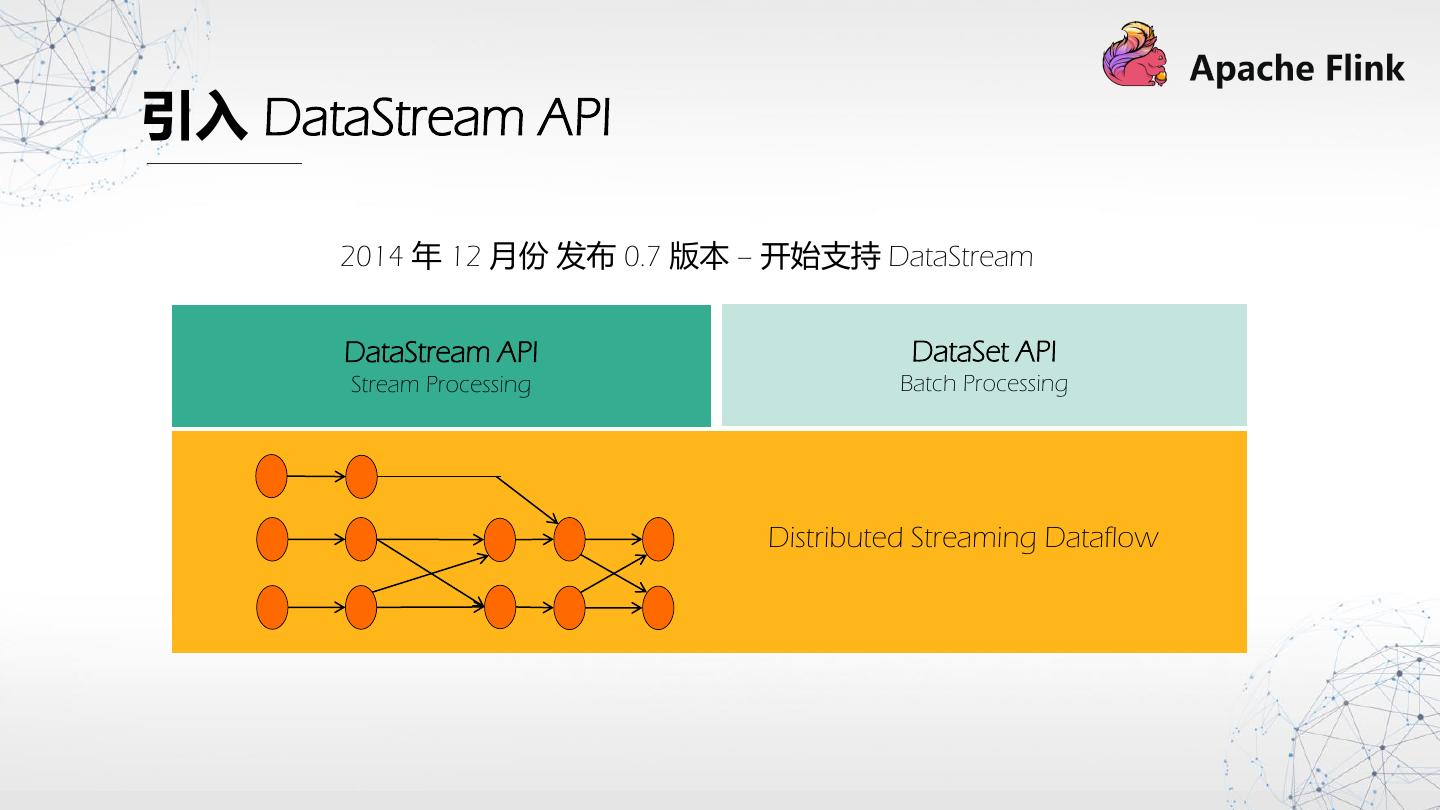 8 .引入 DataStream API 2014 年 12 月份 发布 0.7 版本 – 开始支持 DataStream DataStream API DataSet API Stream Processing Batch Processing Distributed Streaming Dataflow