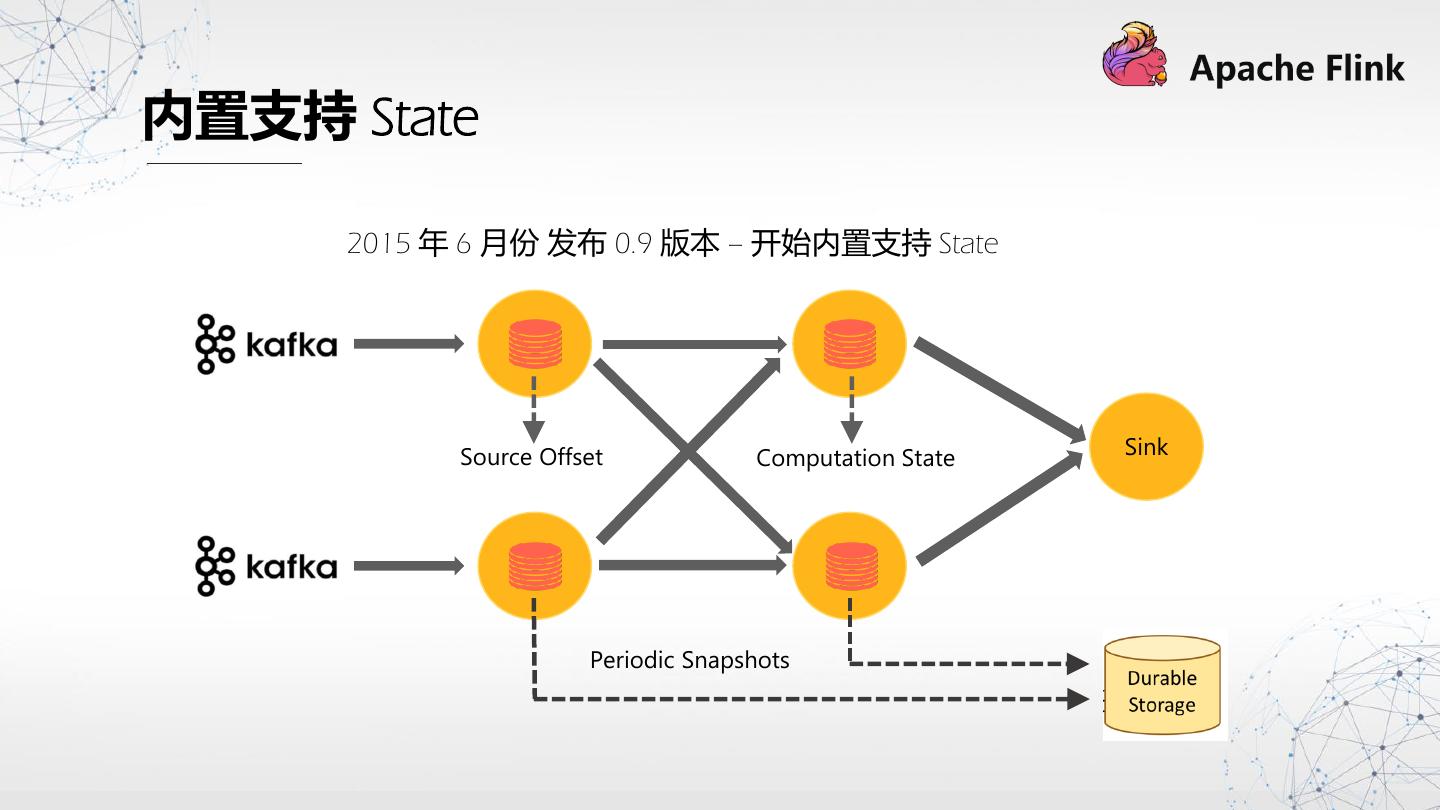 9 .内置支持 State 2015 年 6 月份 发布 0.9 版本 – 开始内置支持 State Source Offset Computation State Sink Periodic Snapshots