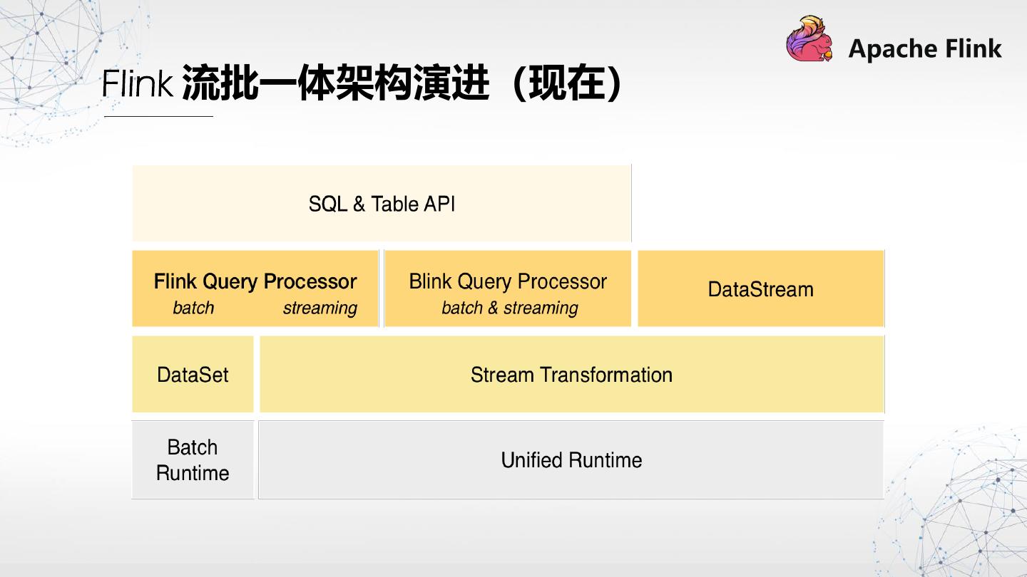 18 . 流批语义一致性 流计算模式: 12:01> SELECT Name, SUM(Score), MAX(Time) FROM USER_SCORES GROUP BY Name; 计算每个用户的总分和 ----------------------------- -------------------------------------------------------- 最后得分时间 | [-inf, 12:01) | [12:01, 12:04) | [12:04, now) | | ------------------------- | ------------------------- | ------------------------- | ------------------------- | | Name | Score | Time | | | Name | Score | Time | | | Name | Score | Time | | | USER_SCORES | | ------------------------- | ------------------------- | ------------------------- | ------------------------- | | | | | | | Julie | 8 | 12:03 | | | Julie | 12 | 12:07 | | | User | Score | Time | | | | | | | | Frank | 3 | 12:03 | | | Frank | 5 | 12:06 | | ------------------------- | ------------------------- | ------------------------- | ------------------------- | | Julie | 7 | 12:01 | ----------------------------- -------------------------------------------------------- | Frank | 3 | 12:03 | | Julie | 1 | 12:03 | | Frank | 2 | 12:06 | 批处理模式: | Julie | 4 | 12:07 | ------------------------- 12:07> SELECT Name, SUM(Score), MAX(Time) FROM USER_SCORES GROUP BY Name; ------------------------- | Name | Score | Time | 1. 流和批计算形式不同,流有 Early Fire ------------------------- | Julie | 12 | 12:07 | 2. 流和批最终结果相同,语义一致 | Frank | 5 | 12:06 | -------------------------