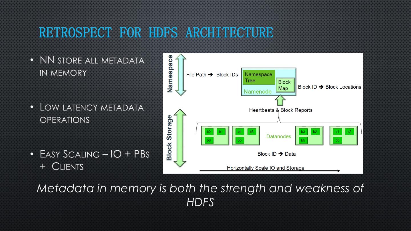 7 . RETROSPECT FOR HDFS ARCHITECTURE • • • Metadata in memory is both the strength and weakness of HDFS