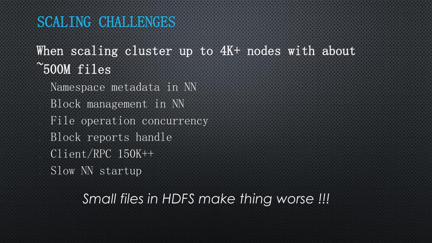 9 .SCALING CHALLENGES When scaling cluster up to 4K+ nodes with about ~500M files o Namespace metadata in NN o Block management in NN o File operation concurrency o Block reports handle o Client/RPC 150K++ o Slow NN startup Small files in HDFS make thing worse !!!