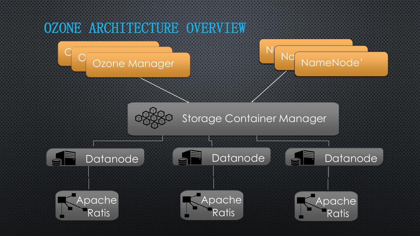 11 .OZONE ARCHITECTURE OVERVIEW Ozone Manager NameNode’ Ozone Manager NameNode’ Ozone Manager NameNode’ Storage Container Manager Datanode Datanode Datanode Apache Apache Apache Ratis Ratis Ratis
