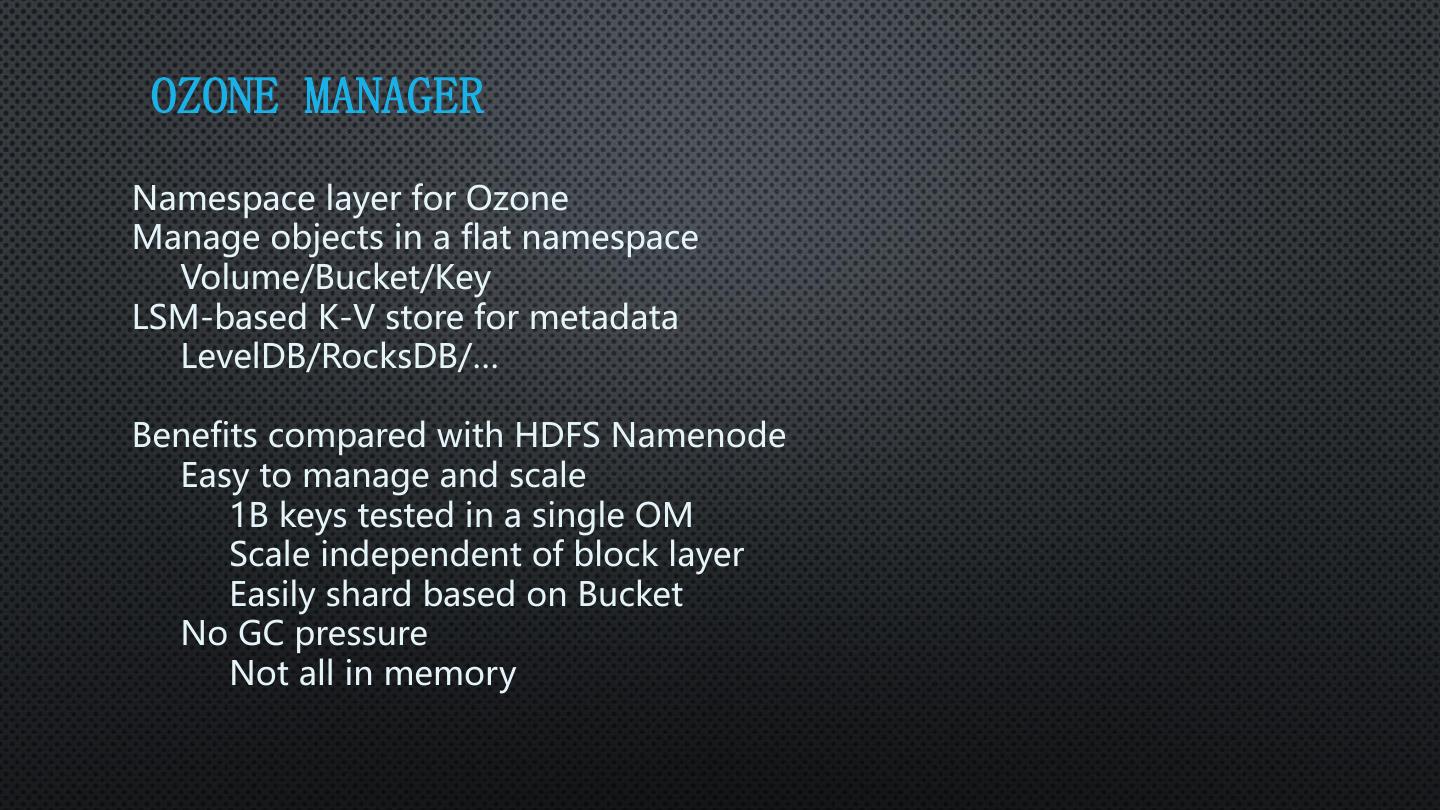 12 . OZONE MANAGER Namespace layer for Ozone Manage objects in a flat namespace Volume/Bucket/Key LSM-based K-V store for metadata LevelDB/RocksDB/… Benefits compared with HDFS Namenode Easy to manage and scale 1B keys tested in a single OM Scale independent of block layer Easily shard based on Bucket No GC pressure Not all in memory