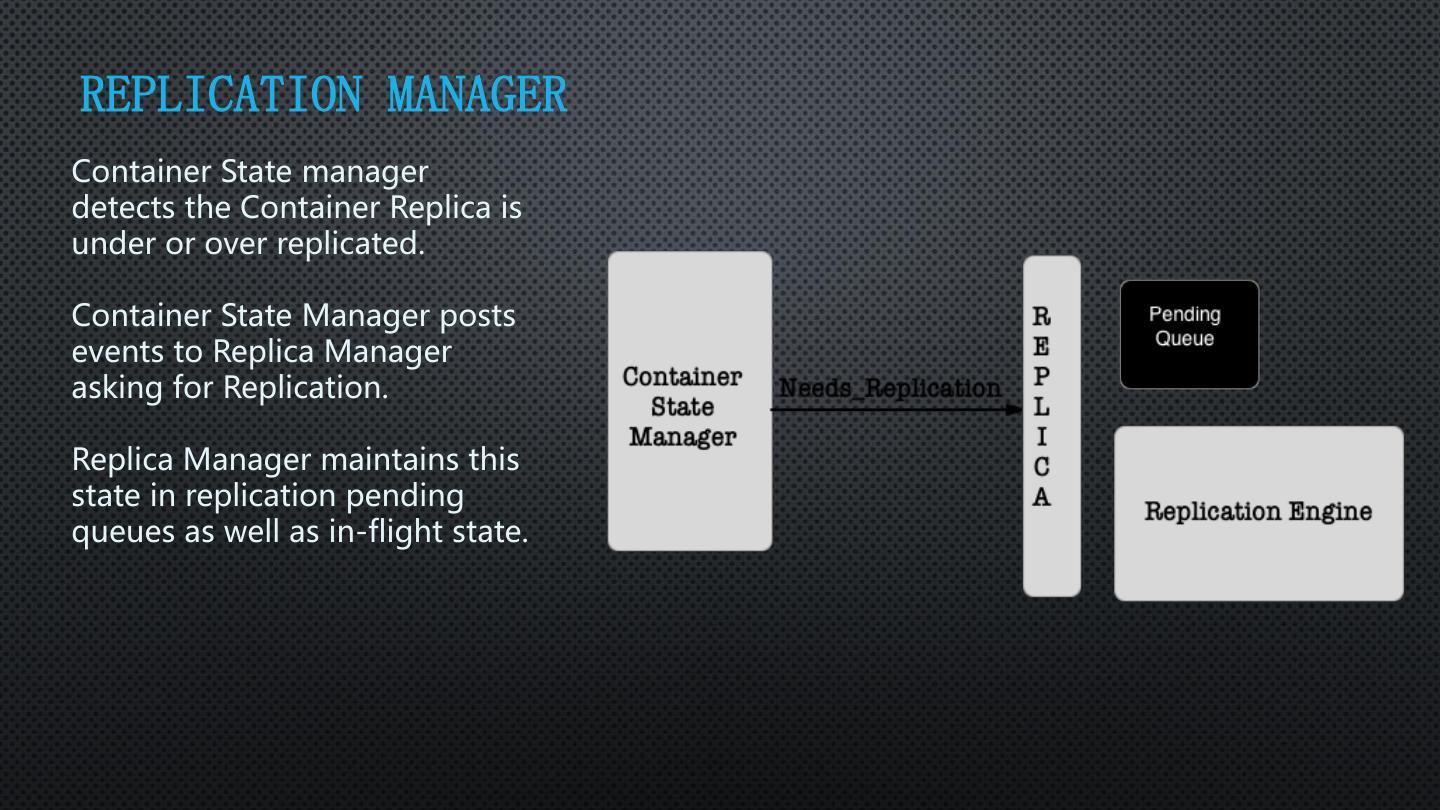 22 .REPLICATION MANAGER Container State manager detects the Container Replica is under or over replicated. Container State Manager posts events to Replica Manager asking for Replication. Replica Manager maintains this state in replication pending queues as well as in-flight state.