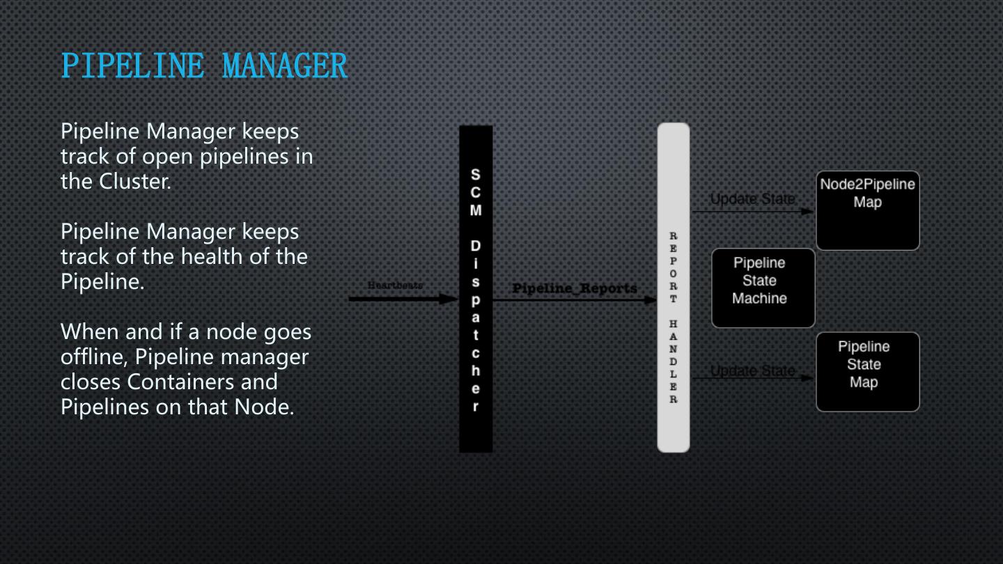 23 .PIPELINE MANAGER Pipeline Manager keeps track of open pipelines in the Cluster. Pipeline Manager keeps track of the health of the Pipeline. When and if a node goes offline, Pipeline manager closes Containers and Pipelines on that Node.