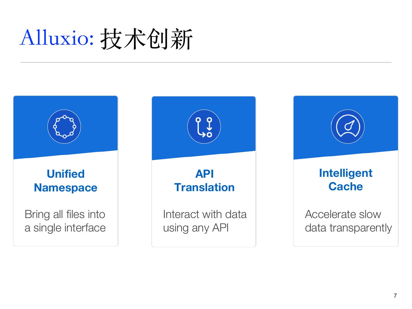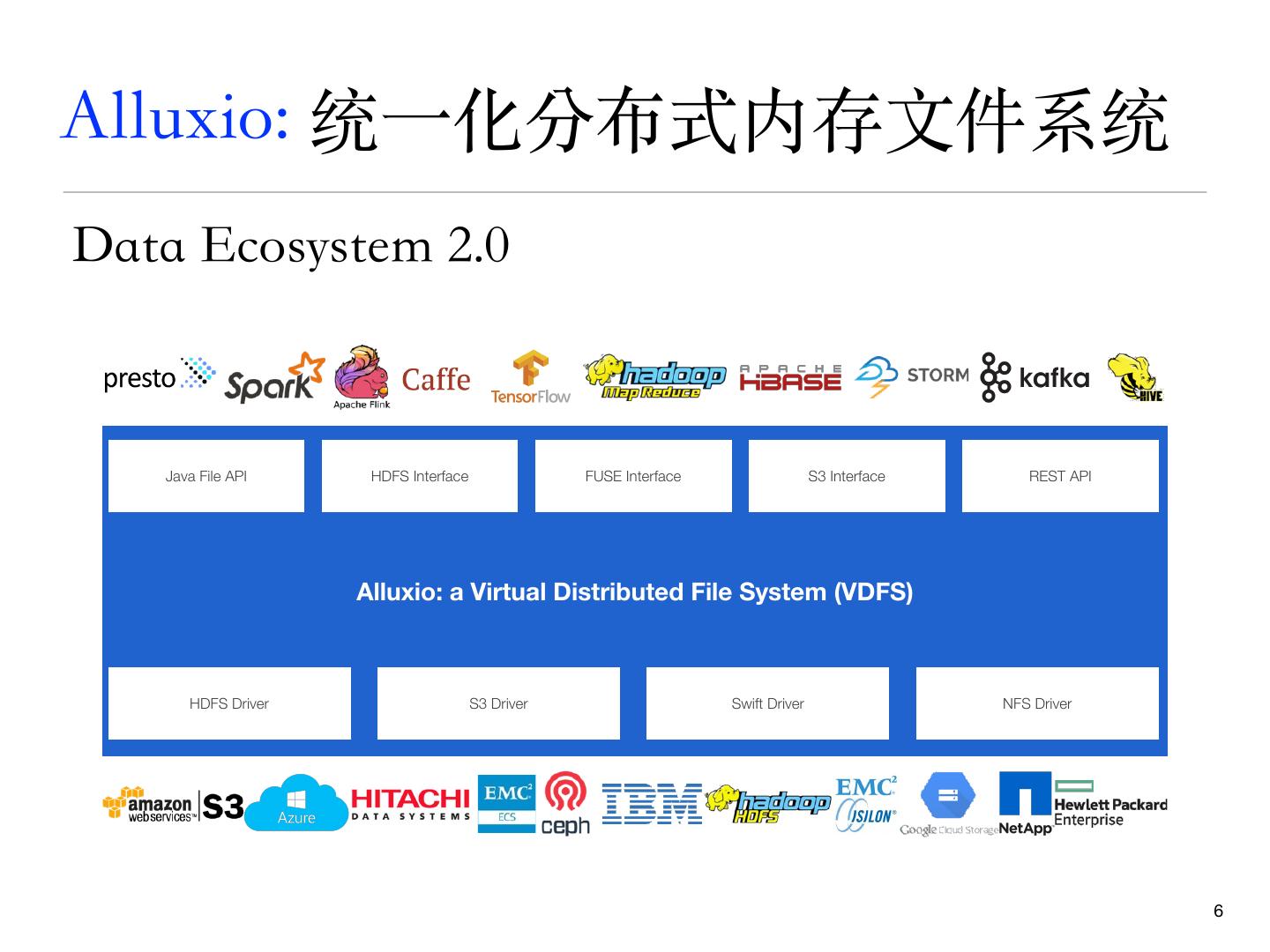 6 .Alluxio: 统⼀化分布式内存⽂件系统 Data Ecosystem 2.0 Java File API HDFS Interface FUSE Interface S3 Interface REST API Alluxio: a Virtual Distributed File System (VDFS) HDFS Driver S3 Driver Swift Driver NFS Driver 6