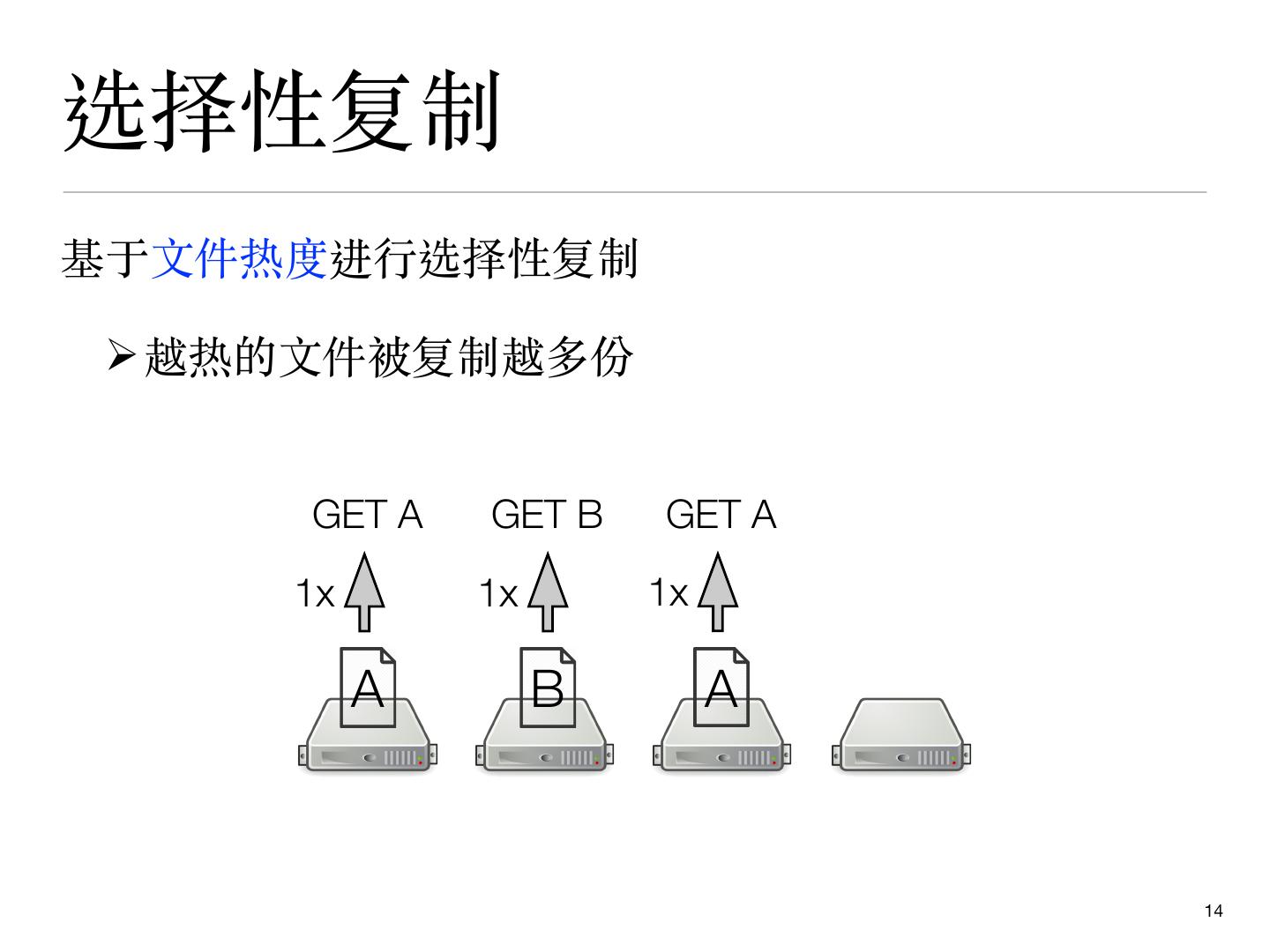 13 .选择性复制 基于⽂件热度进⾏选择性复制 Ø越热的⽂件被复制越多份 GET A GET B 2x 1x A B 13