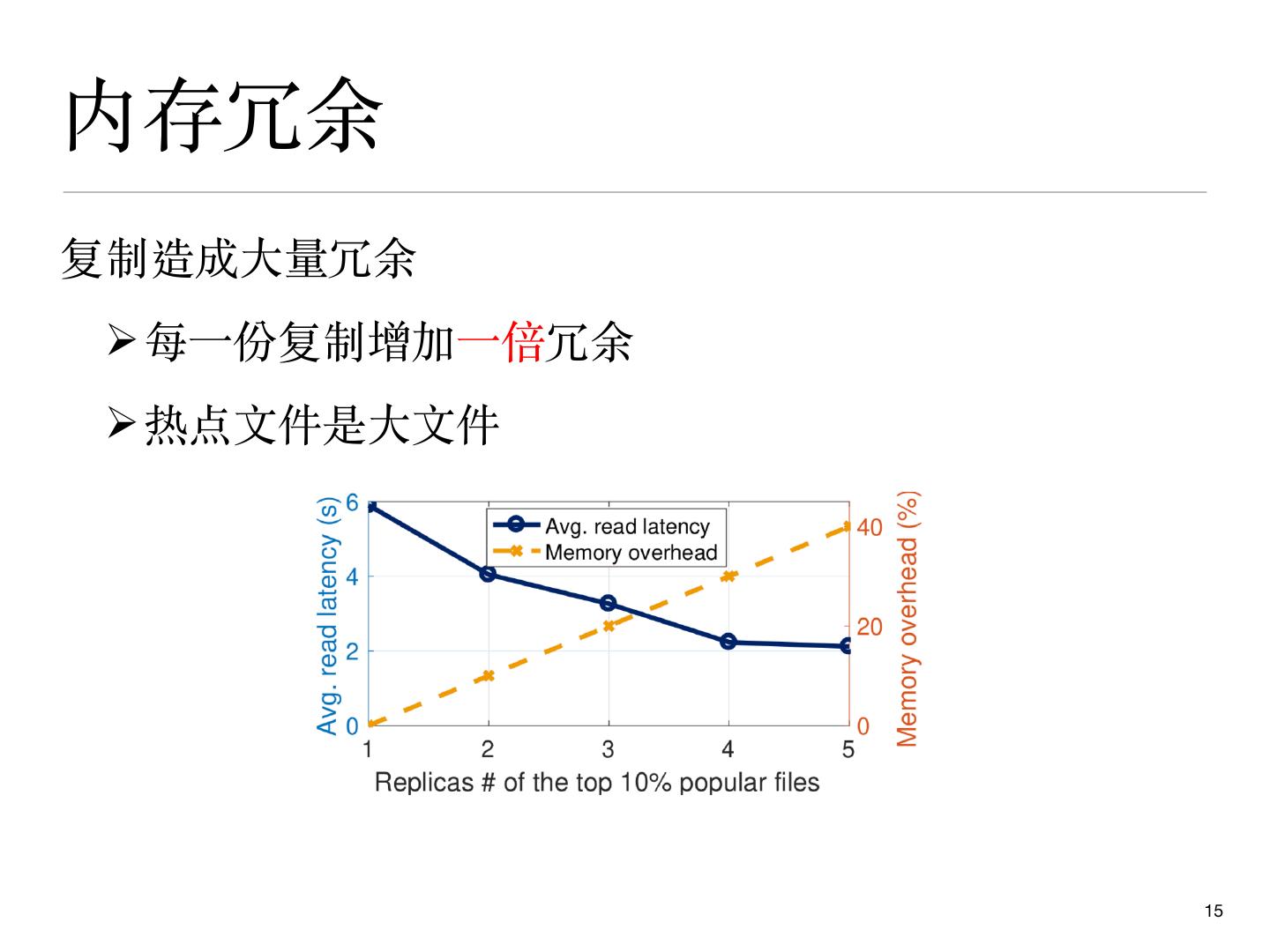 15 .内存冗余 复制造成⼤量冗余 Ø每⼀份复制增加⼀倍冗余 Ø热点⽂件是⼤⽂件 15