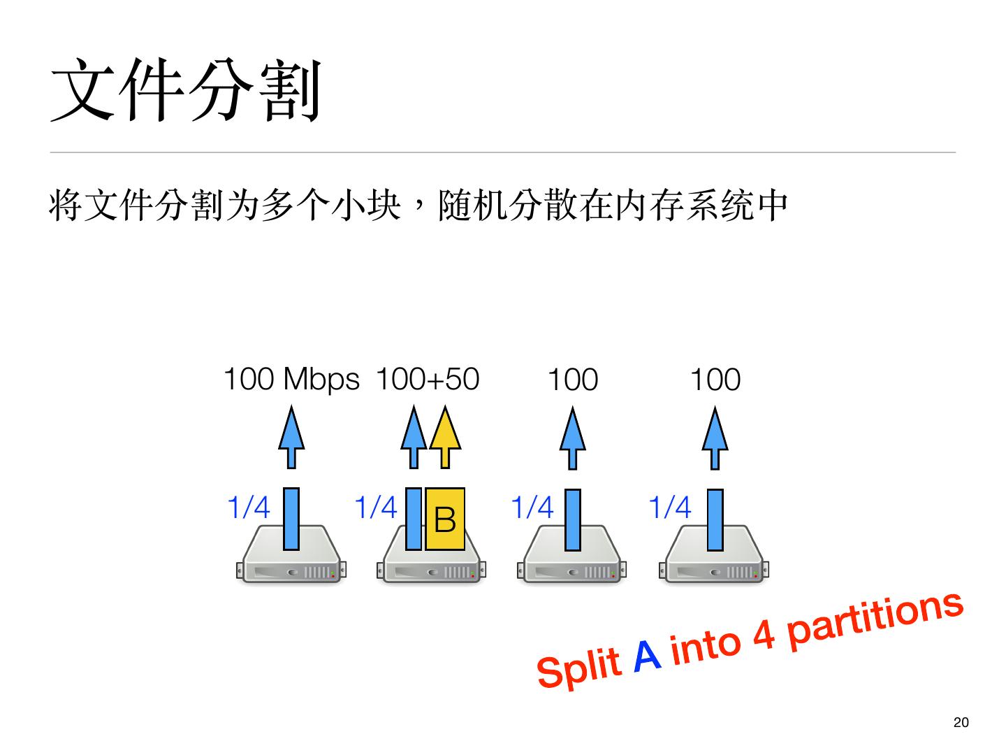 19 .⽂件分割 将⽂件分割为多个⼩块,随机分散在内存系统中 400 Mbps 50 Mbps A B 19