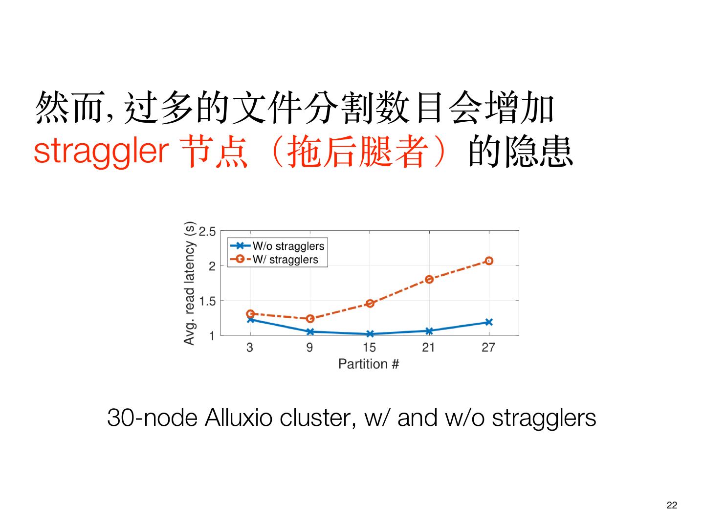22 .然⽽, 过多的⽂件分割数⽬会增加 straggler 节点(拖后腿者)的隐患 30-node Alluxio cluster, w/ and w/o stragglers 22