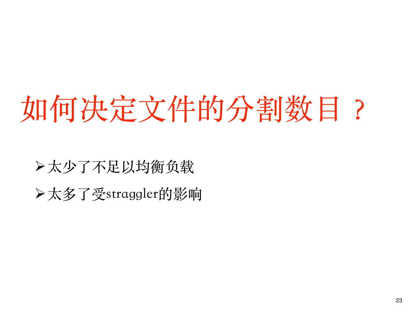 23 .如何决定⽂件的分割数⽬︖ Ø太少了不⾜以均衡负载 Ø太多了受straggler的影响 23